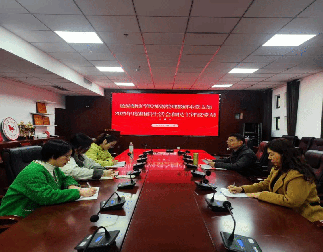 2026年3月11日,旅游管理教研室党支部在学院会议室召开2025年度组织生活会暨民主评议党员大会。会议由支部书记吴子钟主持,支部全体党员参会,学院党总支委员、组织员张程程列席。