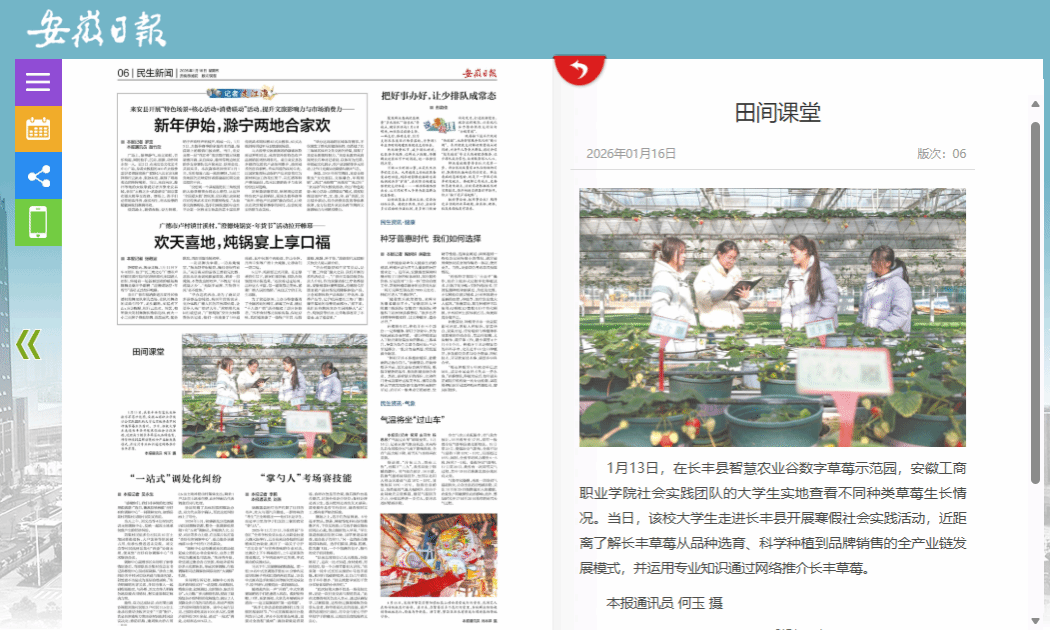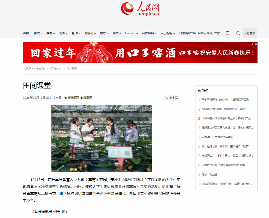 近日,学习强国、人民网、安徽日报等多家主流媒体集中报道了世界第一大赌场,澳门金沙城中心:信息工程学院2026年寒假“返家乡”社会实践活动,引发社会关注。寒假期间,学院“数智助农·E路莓好”社会实践团队赴合肥市长丰县水湖镇,开展以“青春为中国式现代化挺膺担当”为主题的社会实践活动。团队深入长丰县智慧农业谷数字草莓示范园,系统调研草莓产业在品种选育、智慧种植及品牌营销等环节的全链条发展模式,充分发挥专业优势,运用新媒体新技术,通过网络平台积极推介长丰草莓,以青春力量助力家乡农业品牌建设与产业振兴。