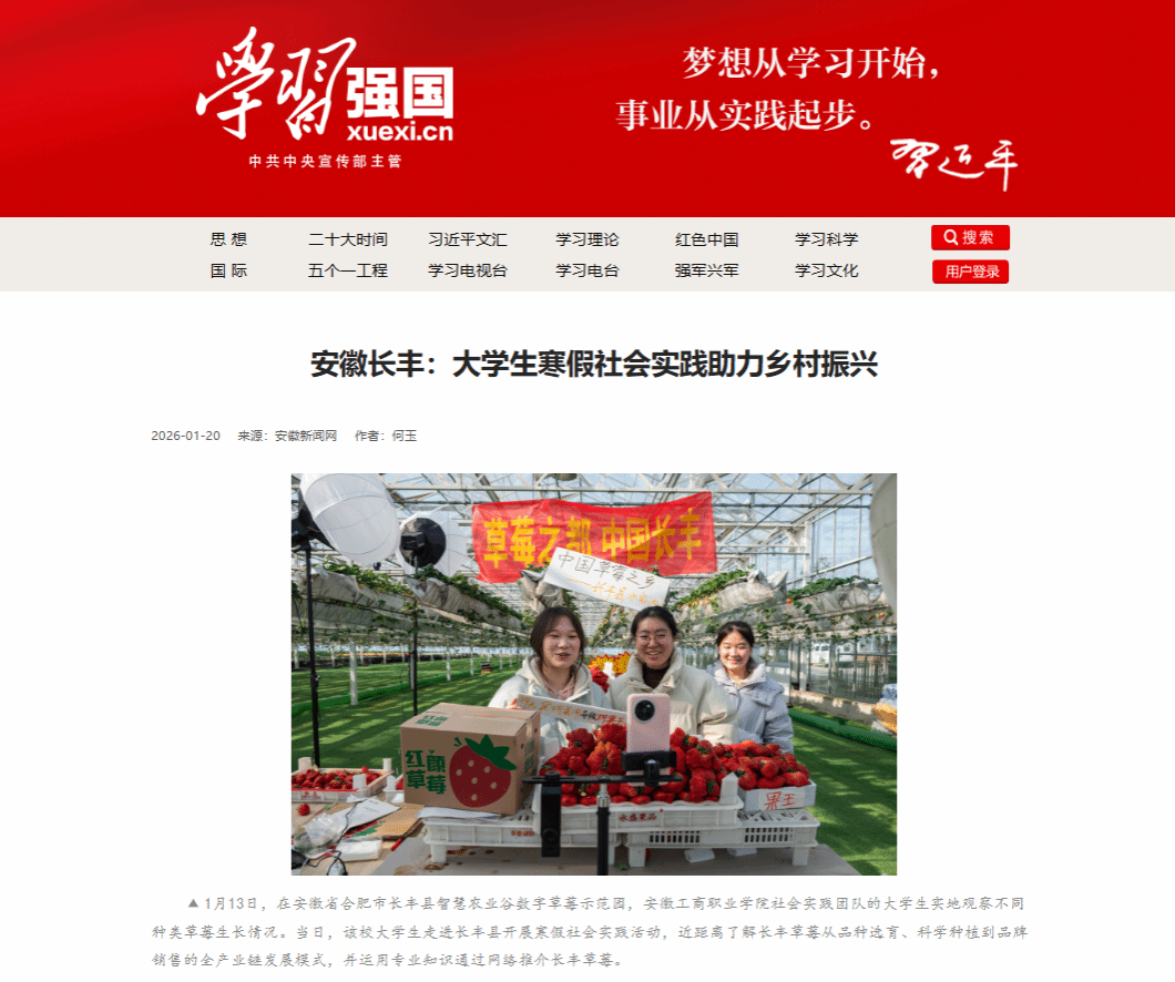 此次社会实践活动不仅提升了学生的专业素养与实践能力,也展现了当代大学生服务社会的责任担当。学习强国、人民网、安徽日报等主流媒体的集中报道,进一步扩大了学院社会实践工作的社会影响力,彰显了学院在引导青年投身基层、服务乡村振兴方面取得的积极成效。(撰稿:何玉 初审:何玉 复审:陈夺 终审:张静雯)