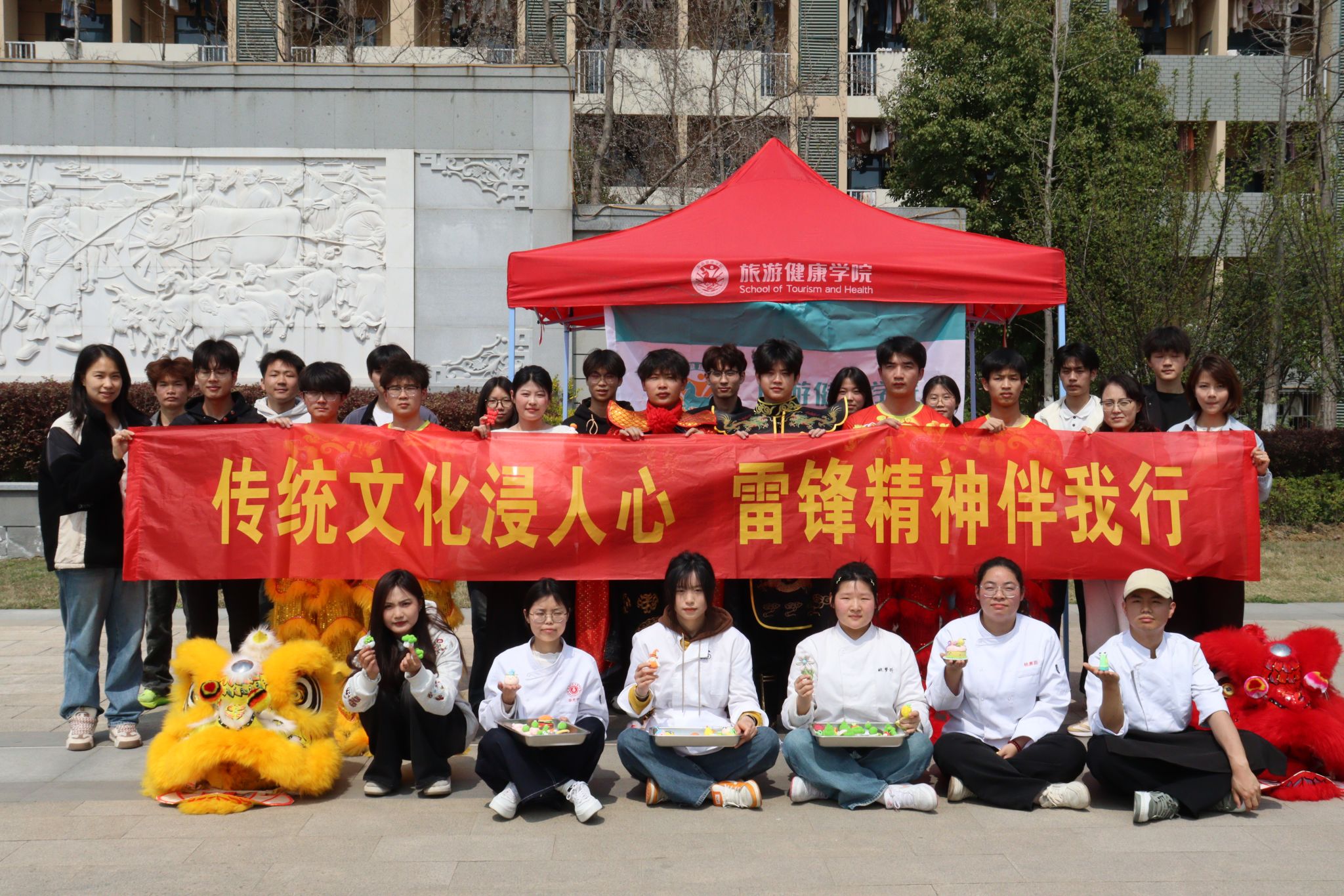 为弘扬中华优秀传统文化,践行新时代雷锋精神,深入推进“三全育人综合改革”,打造特色鲜明的育人实践平台,3月25日中午,旅游健康学院在双凤校区商韵广场举办了“传统文化浸人心,雷锋精神伴我行”主题活动。活动通过民俗舞狮、国粹变脸、传统茶艺、非遗面塑四大非遗展演与互动体验,吸引千余名师生参与,将文化传承与雷锋精神深度融合,打造了一场沉浸式文化实践课堂。
