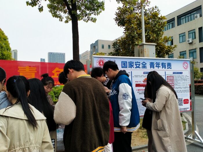 本次活动包括“国家安全”、“校园安全”、“青年有责”三个专场,采用线上推广和线下互动相结合的方式。易班平台在线上发布活动通知,“国家安全”专场,设立4.15主题展报,邀请辖区双凤、杏林派出所进校宣传、答疑,引导学生牢固树立国家安全意识,提升维护国家安全的能力。“校园安全”专场,张贴发放防诈骗、反邪教宣传单,呼吁学生牢固树立防诈骗、反邪教意识,积极参与防诈识骗反邪教的宣传。“5.4青年有责”专场,保卫处(人武部)老师现场宣传大学生征兵相关政策法规,为毕业生解答在庐阳区应征入伍的“七大优势”等。