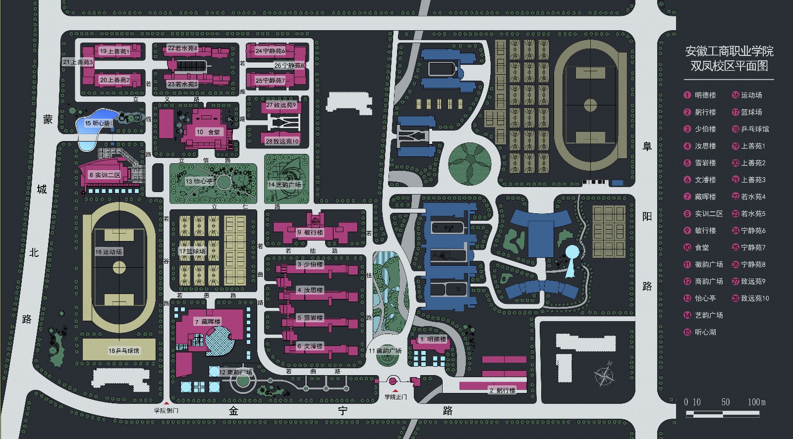 商韵广场,建于2009年9月,由园林和雕塑等景观组成。雕塑名称为“商”,造型融入了徽州马头墙、中国红等设计元素,体现我院是一所培养新徽商人才的院校。雕塑中间嵌入铜质标识,算盘、楚国刀型币、马踏飞燕、地球仪、印刷线路板、“美”型字分别代表我院以12个专业为核心的6大专业群。 |