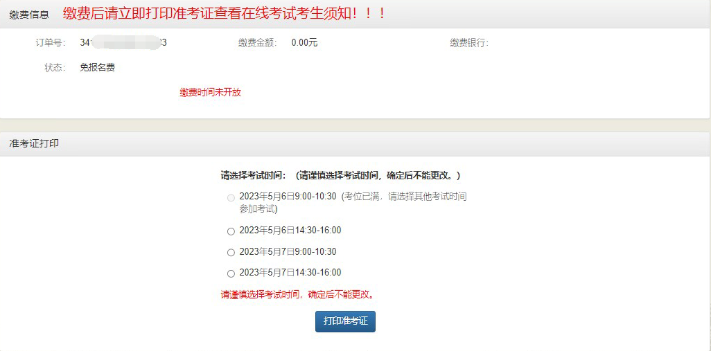缴费成功后系统跳转至考试时间选择页面(免报名费考生点击“缴费与准考证打印”直接选择考试时间)。请慎重选择考试时间参加考试,并打印准考证。