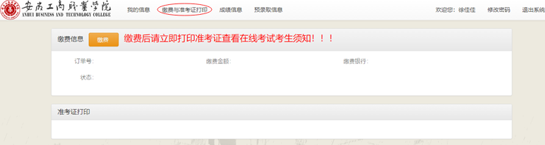 信息无误后点击“缴费与准考证打印”,进入缴费页面。