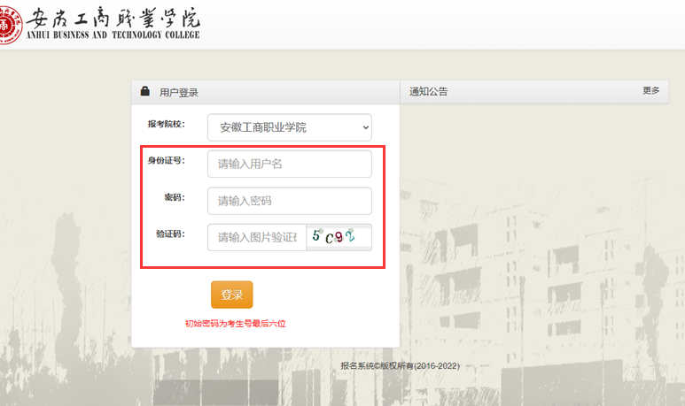 考生使用IE浏览器,登录安徽工商职业学院网站(http://www.ahbvc.edu.cn)“网上报名及缴费入口”,凭身份证号、密码(初始密码为考生号最后六位)和验证码登录报名网站。