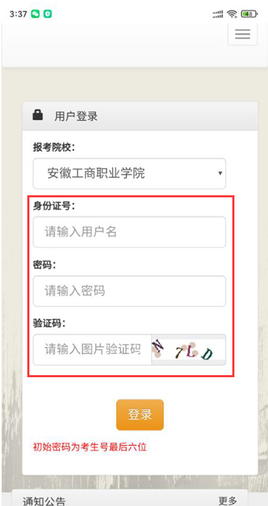 考生使用手机浏览器扫描二维码,访问安徽工商职业学院网上报名系统,凭身份证号、密码(初始密码为考生号最后六位)和验证码登录报名系统。