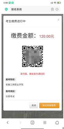 点击确定按钮,跳转至二维码缴费页面(具备支付宝和微信支付条件考生可以扫描二维码支付),也可点击前往网银缴费。