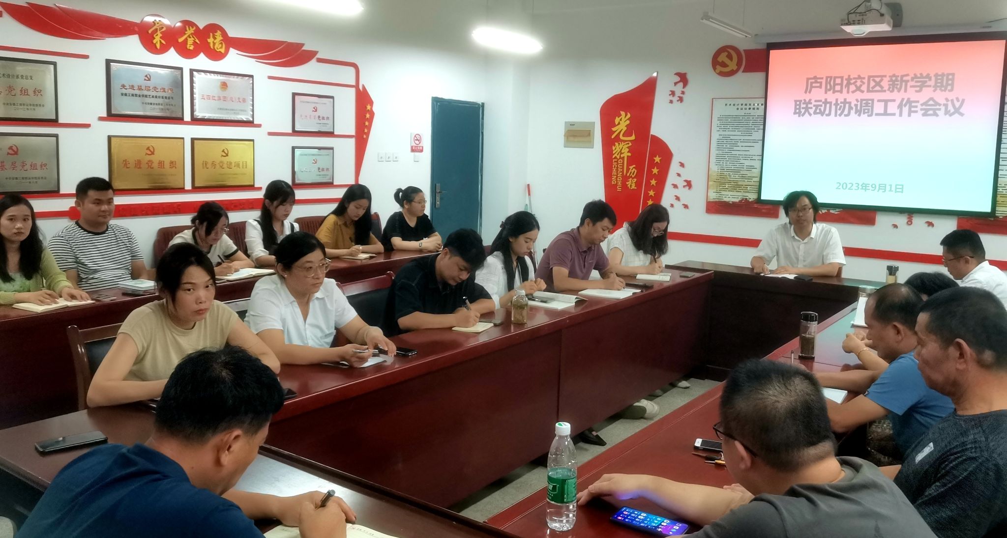9月1日上午,庐阳校区新学期联动协调会议在致知楼三楼党员活动室召开。艺术设计学院、后勤管理处、保卫处、信息化建设与发展处、明德物业公司、大佳一食堂、中天保安等相关负责人员加会议。校党委委员、党委宣传统战部部长、艺术设计学院党总支书记孔成主持会议。