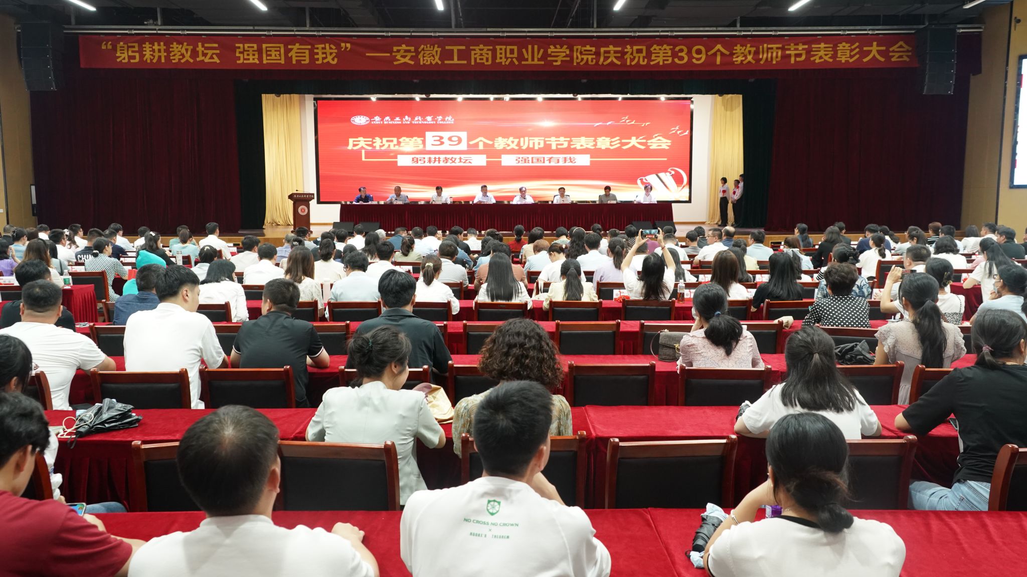 在第39个教师节即将到来之际,9月8日下午,学校在双凤校区大学生活动中心,隆重举行“躬耕教坛、强国有我”----安徽工商职业学院庆祝第39个教师节表彰大会。校领导、全体教师和部分学生代表参加了大会,大会由党委副书记陈行主持。