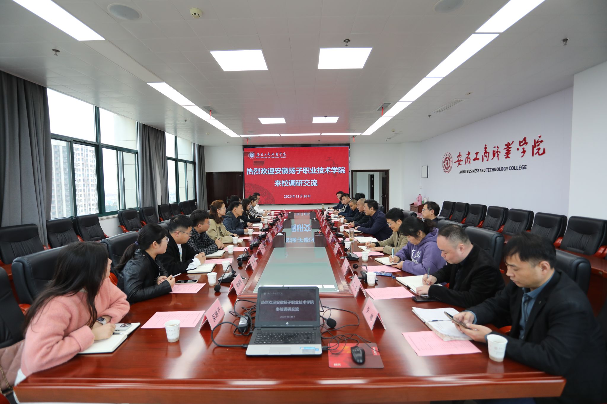 近日,安徽扬子职业技术学院党委副书记陈亮、副院长杨晗一行来校考察交流。党委副书记陈行,党委委员、副校长胡捍东以及办公室、组织人事处、后勤管理处、学生处、校团委等相关部门负责人参加交流会议。