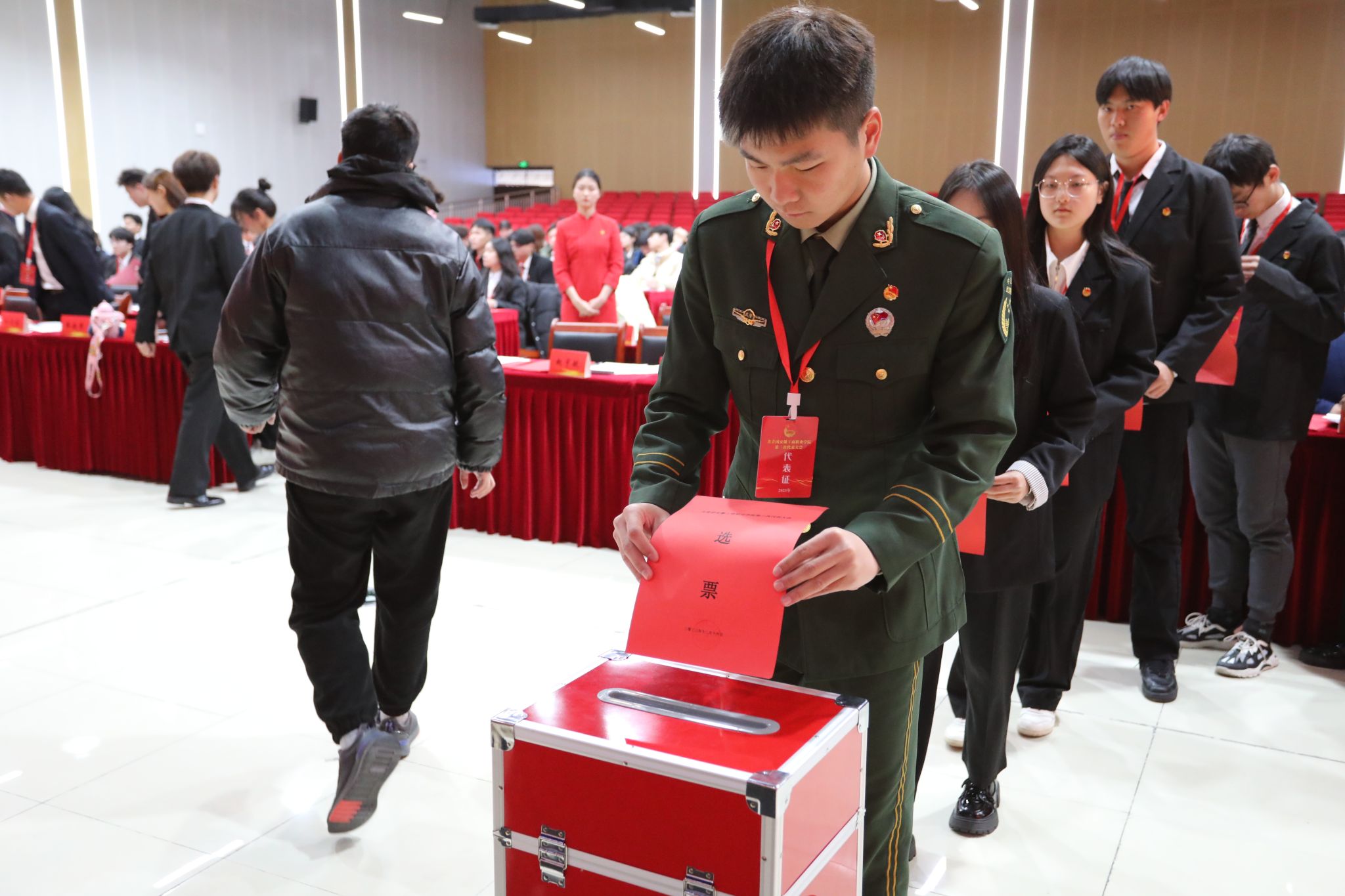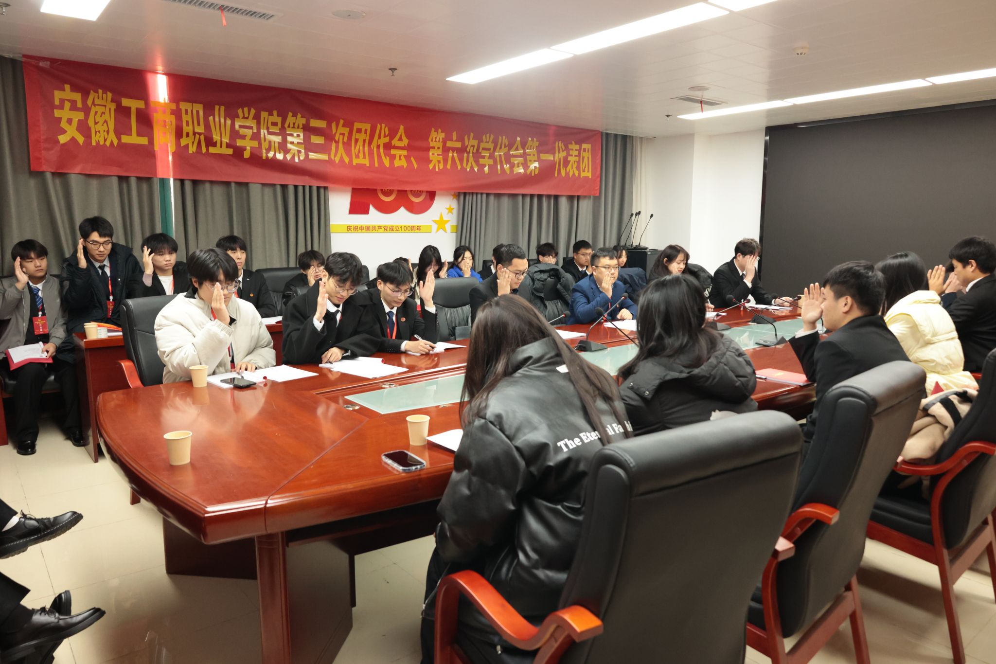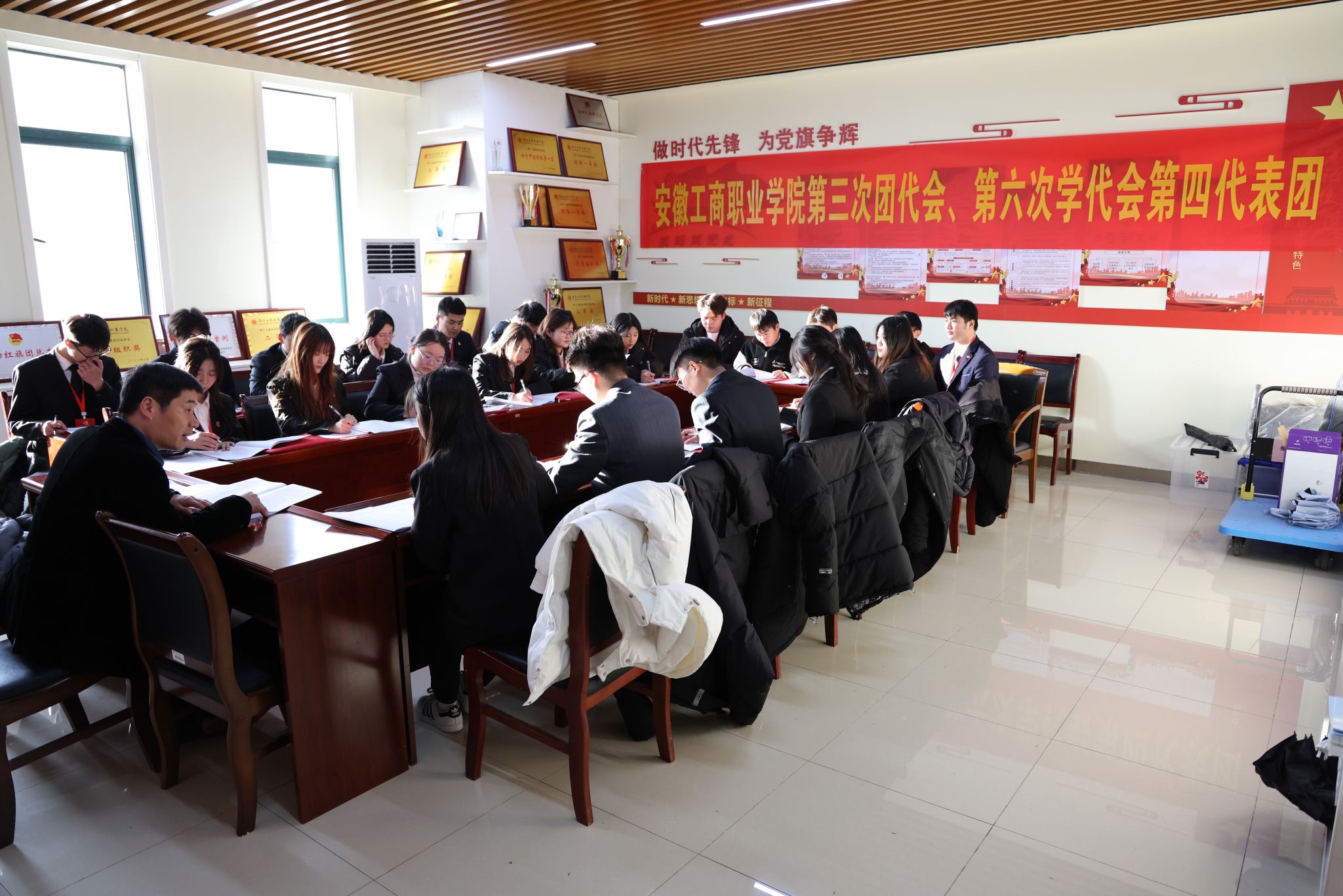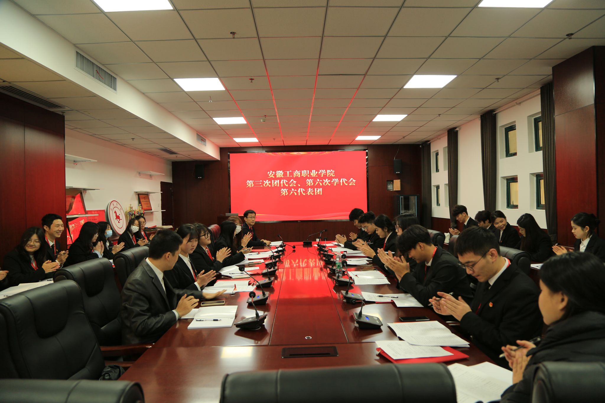 2023年12月16日,共青团安徽工商职业学院第三次代表大会暨安徽工商职业学院第六次学生代表大会在大学生活动中心隆重开幕。省直团工委副书记盛子珈、党委书记齐建平出席会议并讲话。党委领导李雪、陈行、胡捍东、陈章奇、吴松飞、刘浩、孔成、朱小龙出席开幕式,269名团学代表参加大会。