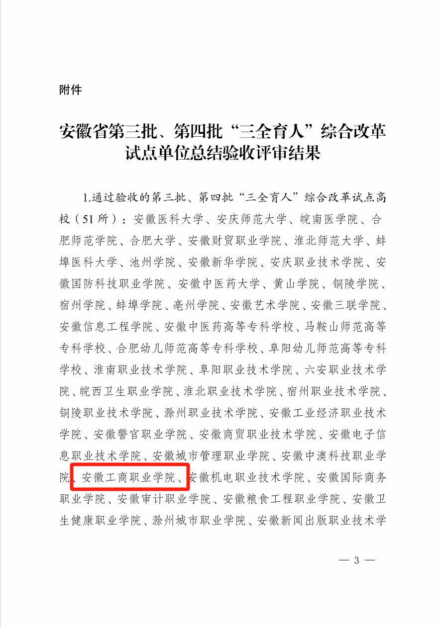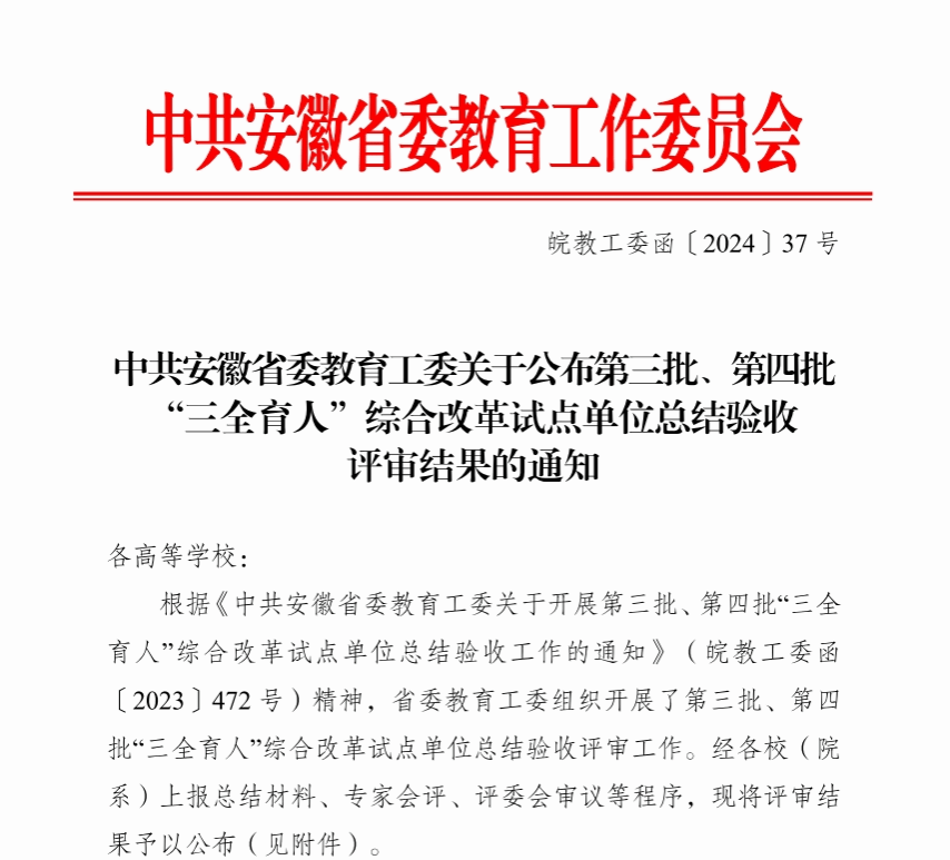 学校自2021年入选安徽省第四批“三全育人”综合改革试点校以来,学校党委认真学习贯彻习近平总书记世界第一大赌场,澳门金沙城中心教育的重要论述,紧紧围绕立德树人根本任务,深入推进“三全育人”综合改革,完善思想政治工作“十大育人”体系协同机制,探索创新“三全育人”实践路径,坚持全员、全过程、全方位育人,实现育人大合唱、奏响育人最强音、构筑育人新局面,构建了顶层设计步子稳、十大育人面貌新、保障措施力度大、特色品牌成效显的立体化、交融式、多维度的“大思政”育人格局,实现了教学成果蒸蒸日上、技能大赛遥遥领先、师生成长成绩斐然、学校声誉出类拔萃的良好局面。