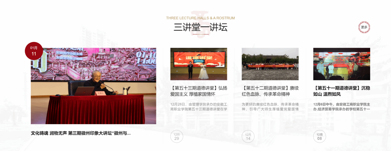 学校以习近平新时代中国特色社会主义思想为指导,深入贯彻落实习近平总书记在学校思想政治理论课教师座谈会上重要讲话精神,落实立德树人根本任务,切实提升高校育人水平,着力推动大思政格局以党建引领为抓手,对接专业课程、结合商业文化背景、拓展实践育人新模式,做红党建课堂,做实专业课堂,做深文化课堂,做活实践课堂。深入推进“三商融合”特色校园文化建设工程,擦亮“工商大讲堂”“道德讲堂”“意匠讲堂”和“徽州印象大讲坛”文化品牌,聚焦文化认同、培育文化自觉、提升文化自信,打造“以文化人、以文育人”的“浸润式”育人新格局。