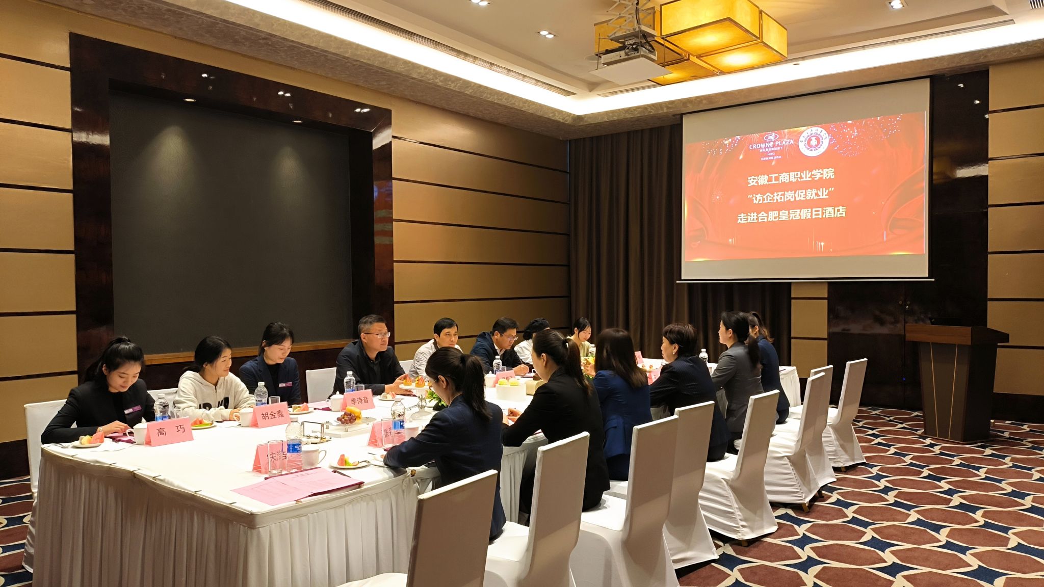 在校企双方座谈交流中,合肥皇冠假日酒店、合肥贝斯特韦斯特精品酒店负责人介绍了企业文化、培训晋升、人才需求等情况,双方就产教融合、人才培养模式创新、实习就业岗位拓展等问题进行了广泛探讨,并与优秀毕业生、实习生代表进行座谈交流。