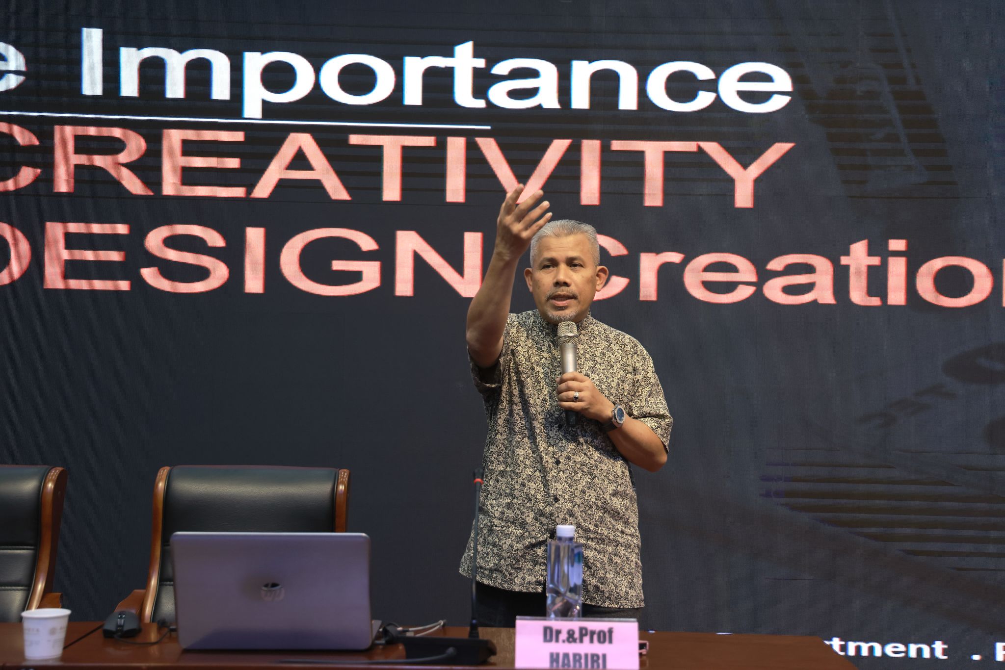 默罕默德·哈里里·宾·阿卜杜拉教授以其卓越的学术背景和丰富的行业经验,从个人求学的英国顶尖学府,到Motor Panels公司的实践探索,再到马来西亚设计协会的领导岗位,继而在高等教育领域的深耕细作,在设计与教育领域有卓越贡献。他围绕创新引领设计潮流,创意点亮生活主题,通过汽车设计之美与创意设计的实践案例,分享设计是科学逻辑与艺术想象的完美联姻,需根植于现实生活,解决实际问题。这一理念在其展示的设计作品及学生案例中得到生动体现。