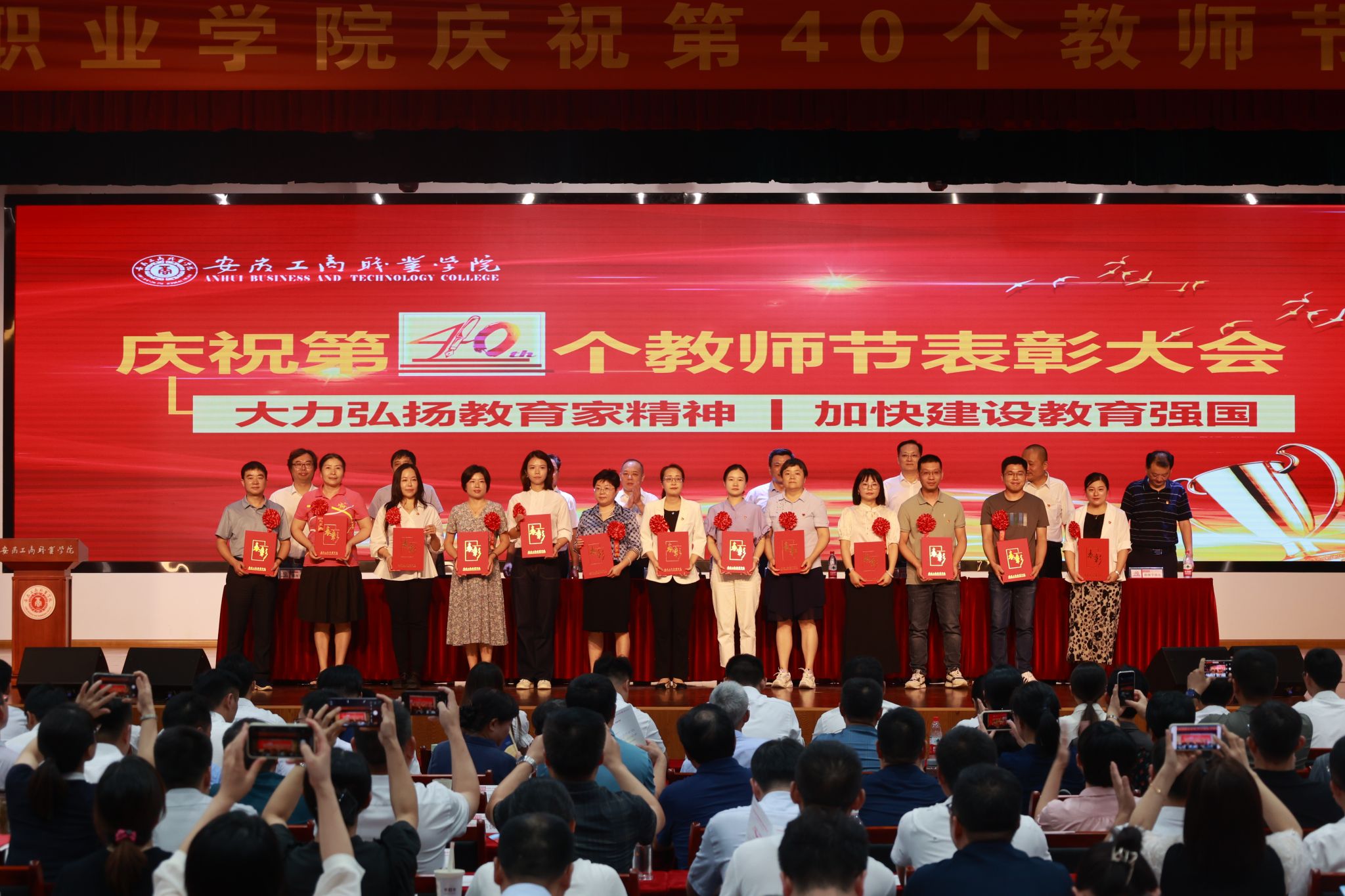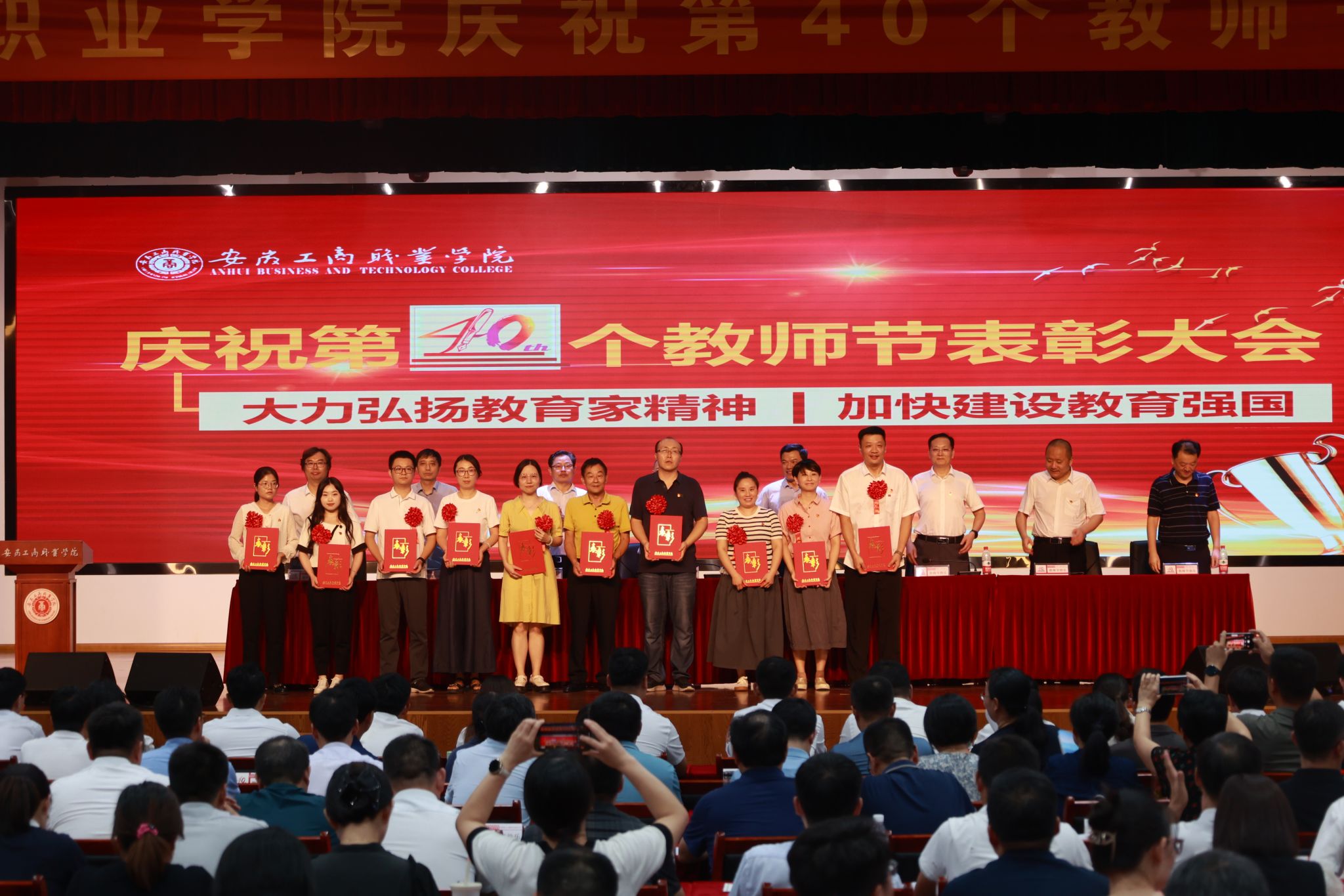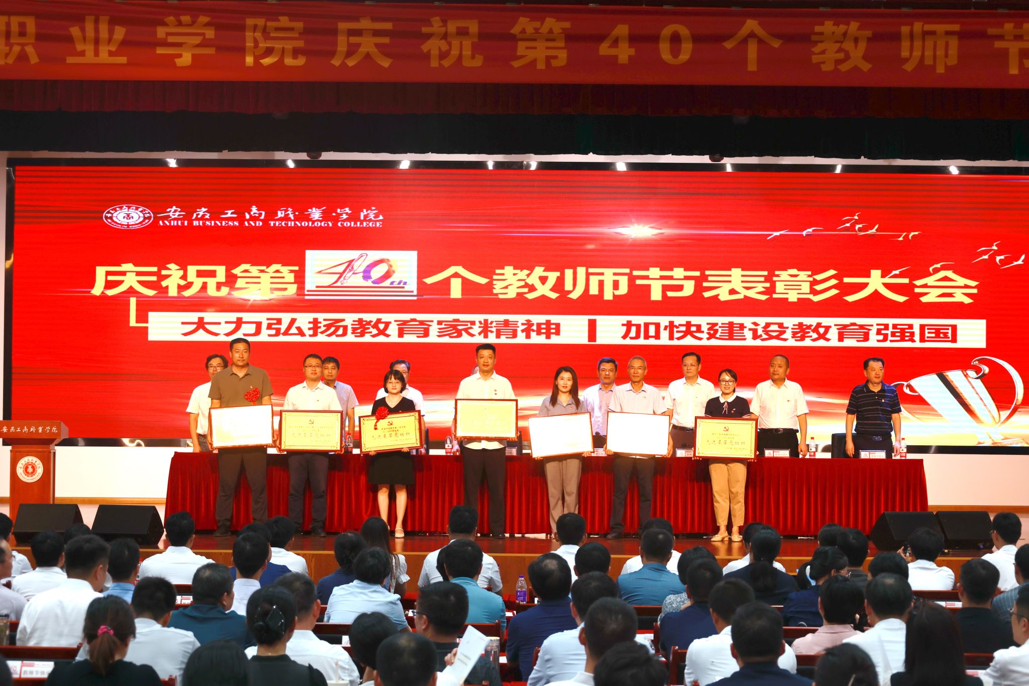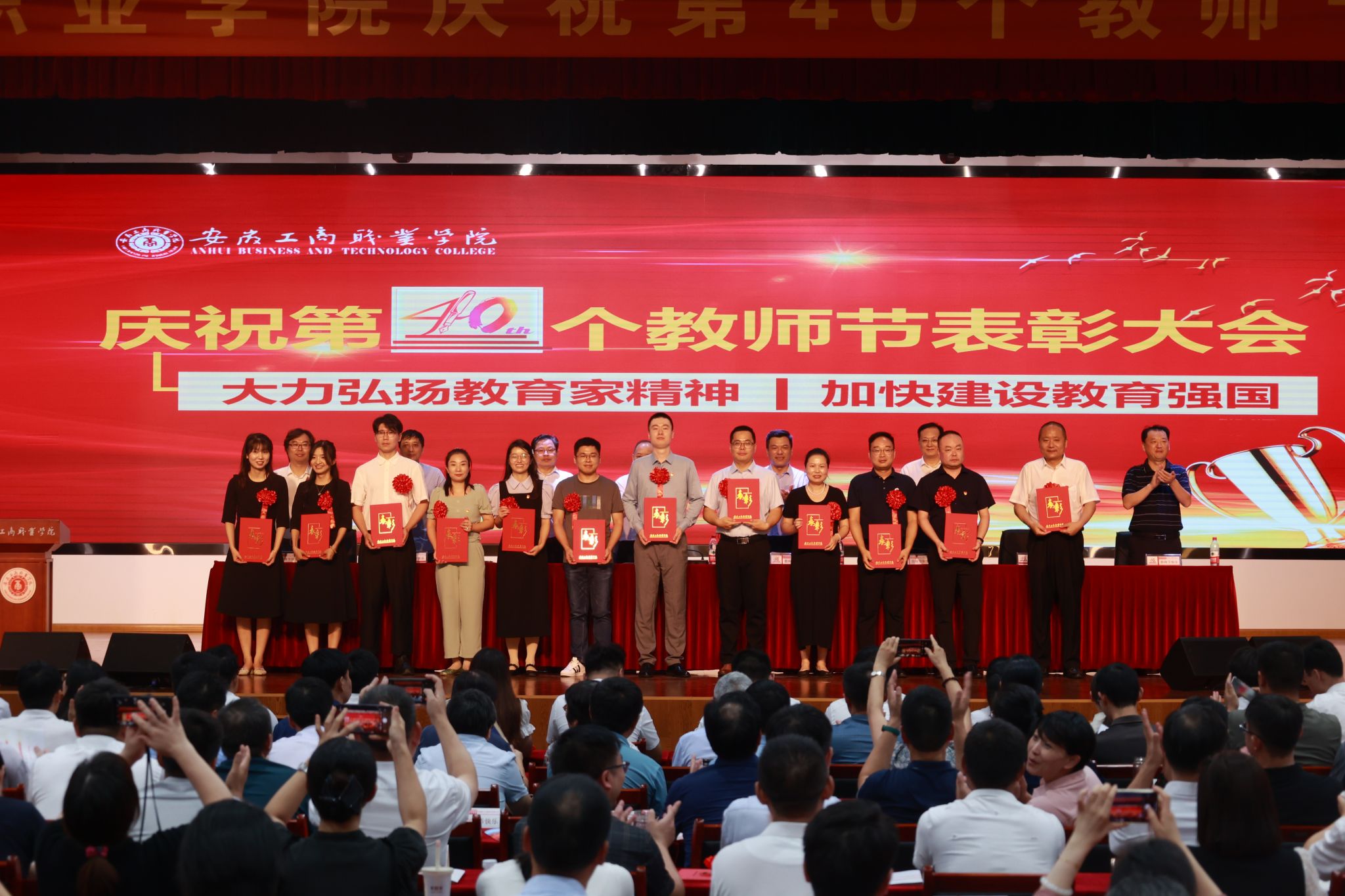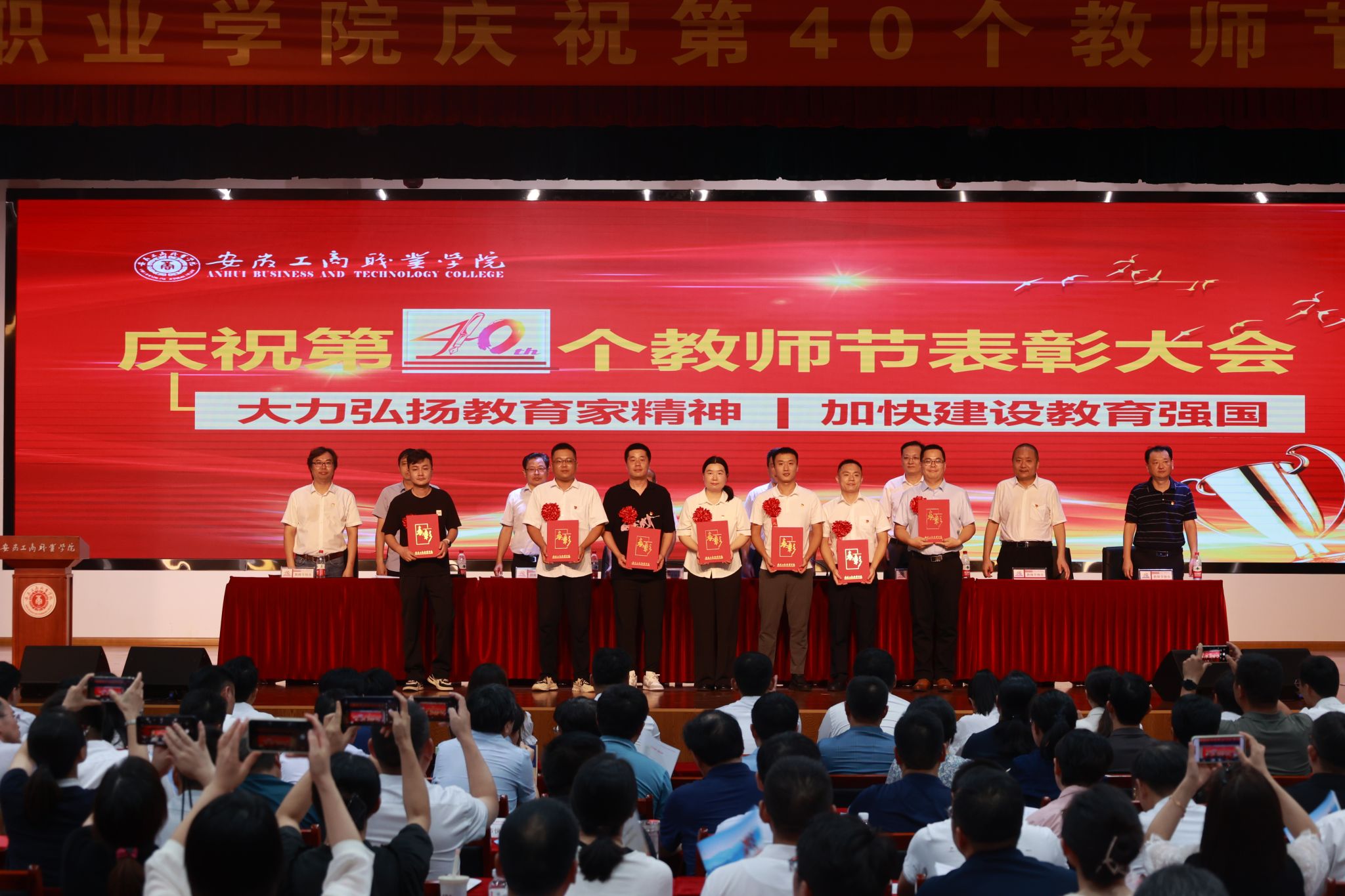 9月10日下午,学校在双凤校区大学生活动中心举行“大力弘扬教育家精神,加快建设教育强国”----安徽工商职业学院庆祝第40个教师节表彰大会。校党政领导班子、全体教职工和部分学生代表参加大会,大会由校党委副书记陈行主持。
