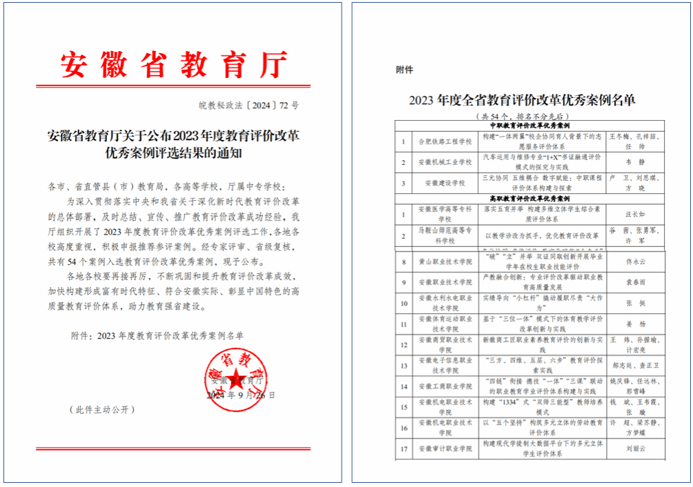 近日,安徽省教育厅公布《安徽省教育厅世界第一大赌场,澳门金沙城中心公2023年度教育评价改革优秀案例评选结果的通知》,学校报送的《“四链”衔接德技“一体”“三课”联动的职业教育学业评价体系构建与实践》荣获安徽省2023年度教育评价改革优秀案例,高职院校共18个案例入选。