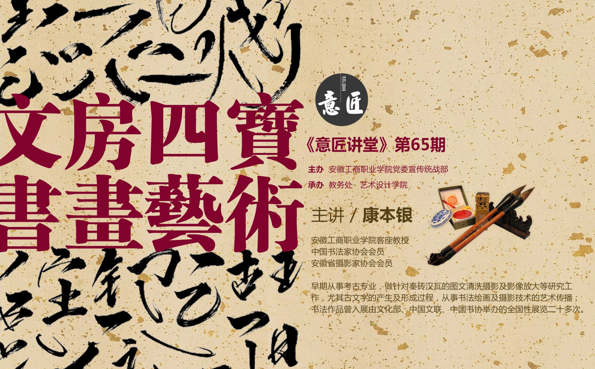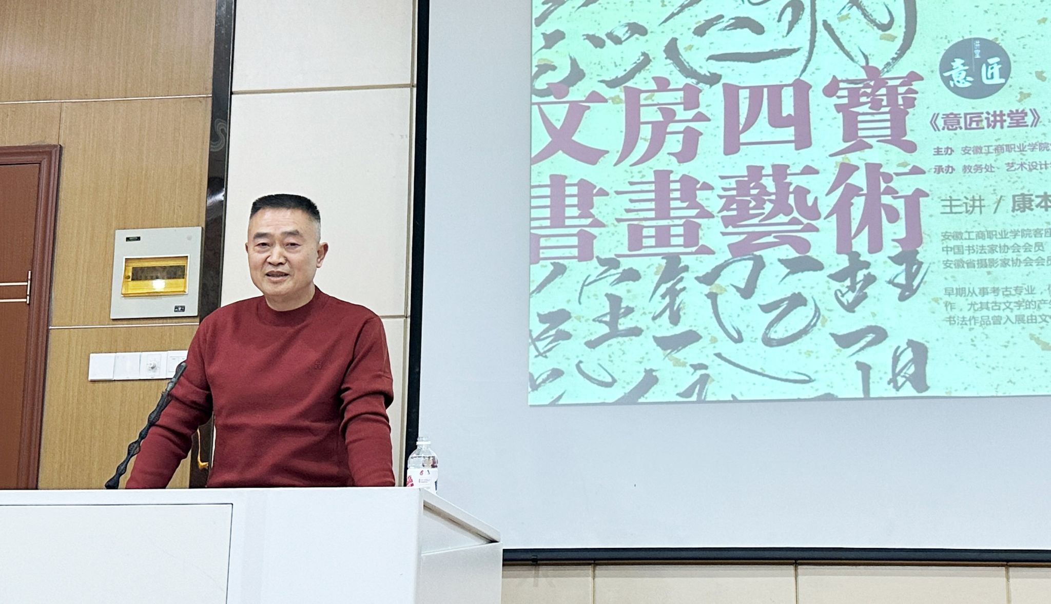 12月18日晚,安徽工商职业学院第六十五期意匠讲堂《文房四宝与书画艺术》在庐阳校区开讲。本期讲堂特邀安徽工商职业学院艺术设计学院客座教授、中国书法家协会会员康本银担任主讲。