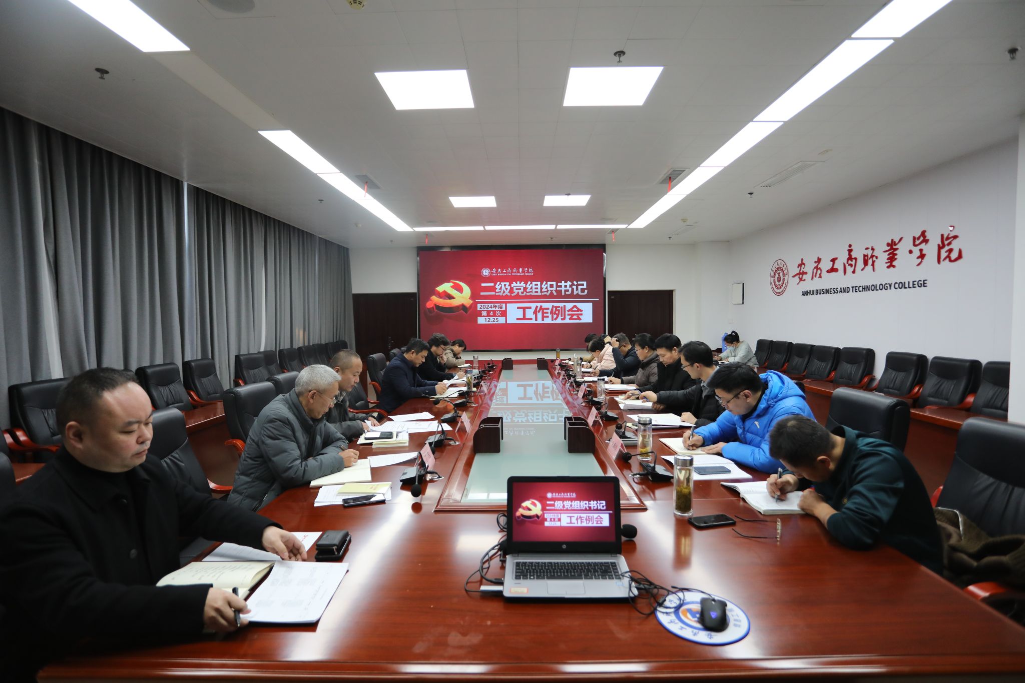 2024年12月25日下午,学校在综合楼三号会议室召开本年度第四次二级党组织书记工作例会。校党委副书记陈行,校党委委员、组织人事处处长刘浩,校党委委员、党委宣传统战部部长孔成出席会议,各二级党组织书记参加会议。会议由陈行主持。