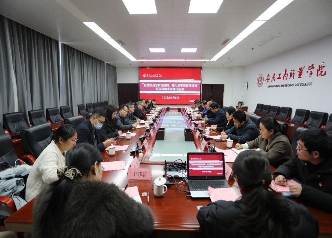 校党委书记齐建平在致辞中对共建支部到校表示欢迎,并介绍了学校办学历史、内涵建设的特色、近年来取得的成绩和开展“联学共建”的意义。安徽职业技术学院党委副书记、院长盛鹏带领大家学习了习近平总书记在中央政治局民主生活会上的重要讲话精神。安徽省招标采购协会会长殷君伯带领大家学习国家主席习近平2025年新年贺词。安徽省教育厅监审处副处长、二级调研员曹玉建以《牢记光荣使命 强化政治监督—从巡视角度看高校内部风险防控》为题,给大家上了一堂生动的党课。