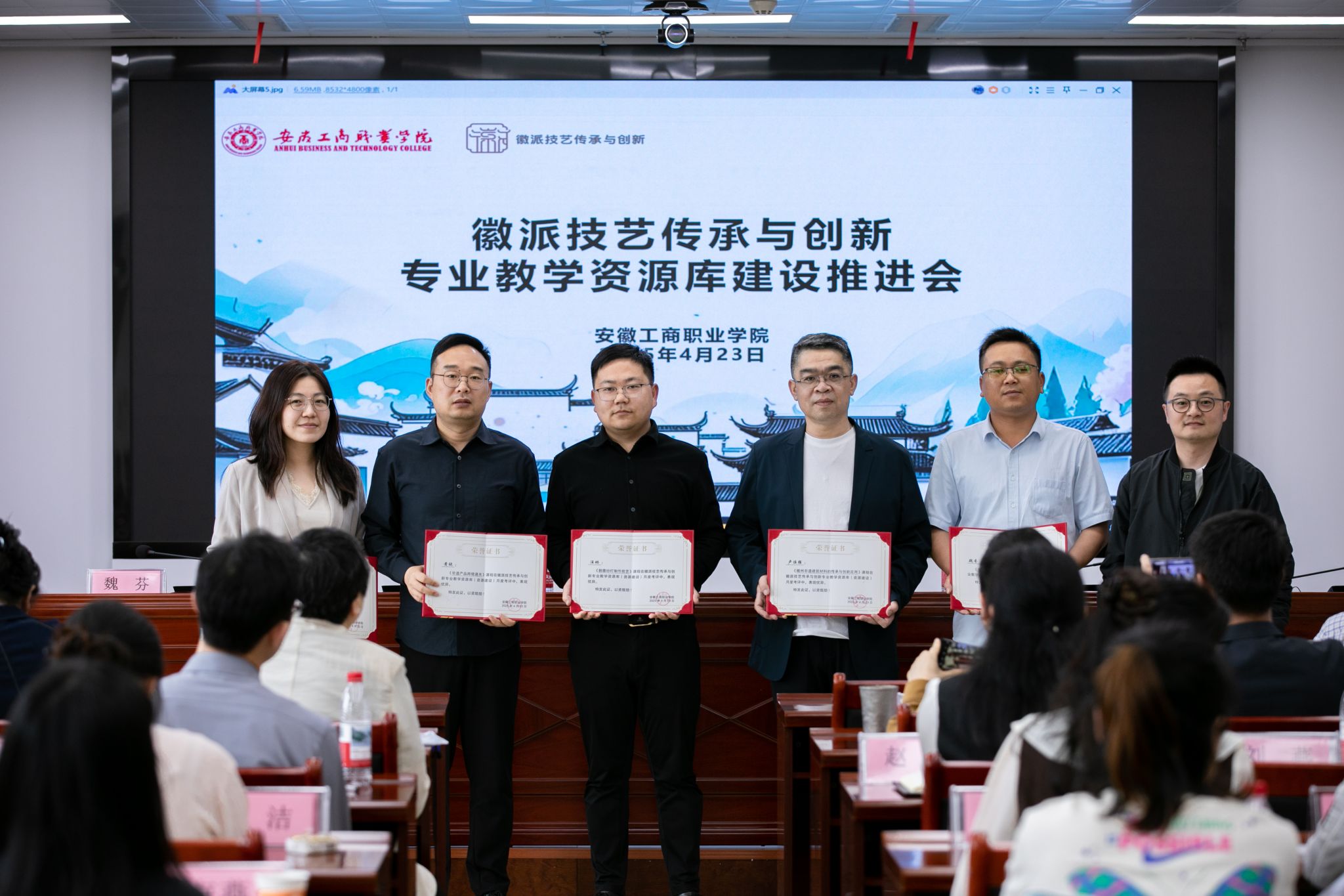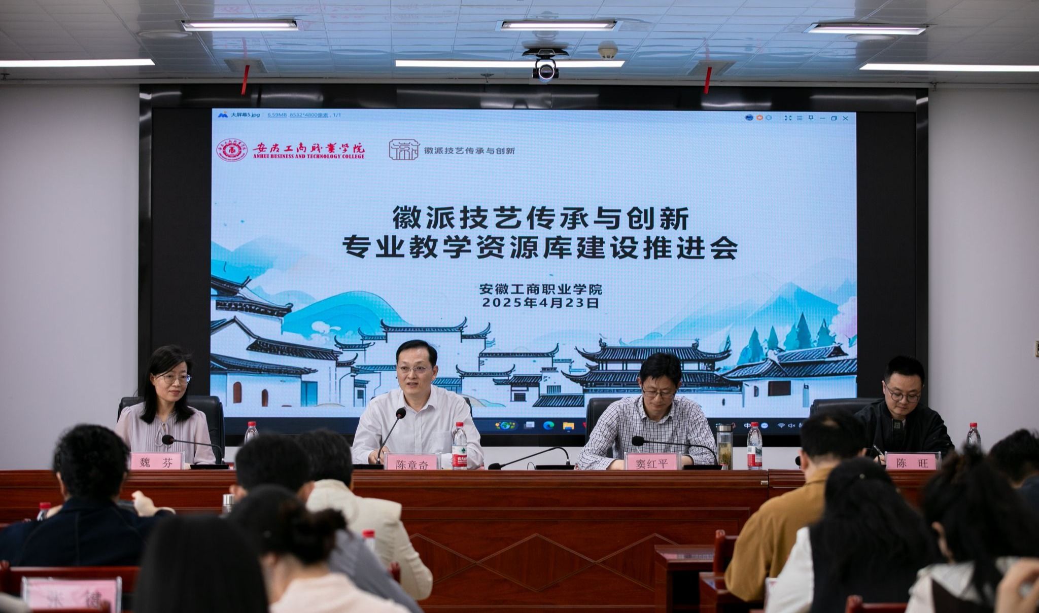 4月23日下午,徽派技艺传承与创新专业教学资源库建设培训推进会在安徽工商职业学院双凤校区顺利召开。安徽工商职业学院党委委员、副院长陈章奇,合肥职业技术学院办公室主任窦红平,安徽机电职业技术学院艺术设计学院院长陈旺等牵头单位负责人,以及9个子项目负责人、54门课程负责人出席会议。重庆电力高等专科学校伍家洁教授受邀远程参会并作专题指导。会议由艺术设计学院院长魏芬主持。