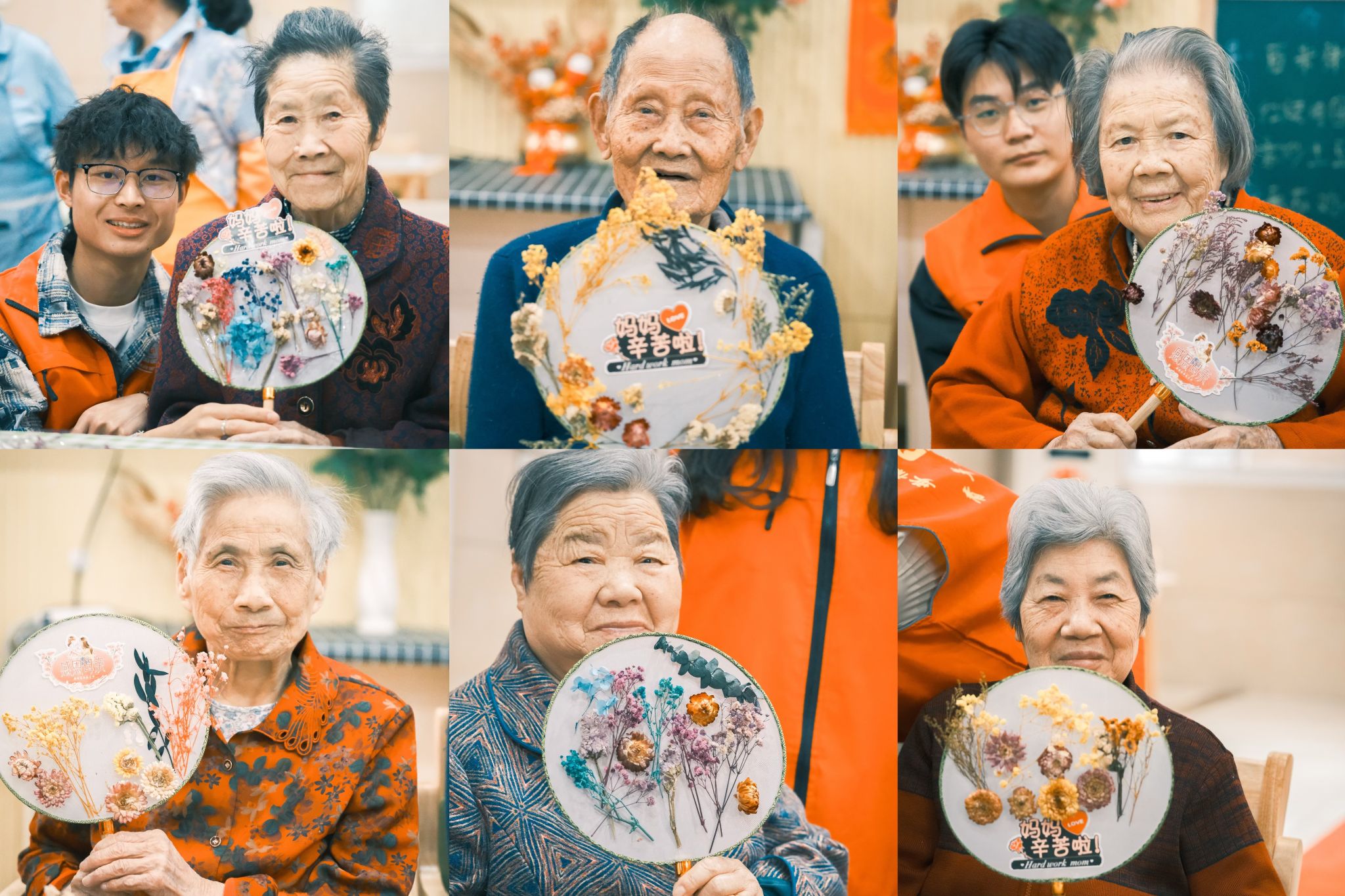 歌声渐歇,一场别开生面的团扇DIY活动随即展开。志愿者们提前准备了空白团扇、干花、装饰带、彩绘颜料等材料,耐心讲解制作步骤。老人们兴致盎然,在志愿者的协助下,将花瓣、枝叶精心粘贴于扇面,或用画笔勾勒出荷花、青松等寓意吉祥的图案。活动期间,志愿者们分组陪老人聊天、修剪指甲、整理房间。听抗战老兵讲述烽火岁月,陪“老教师”回忆执教生涯,为卧床老人读报按摩……点滴细节中传递着跨越年龄的温情。
