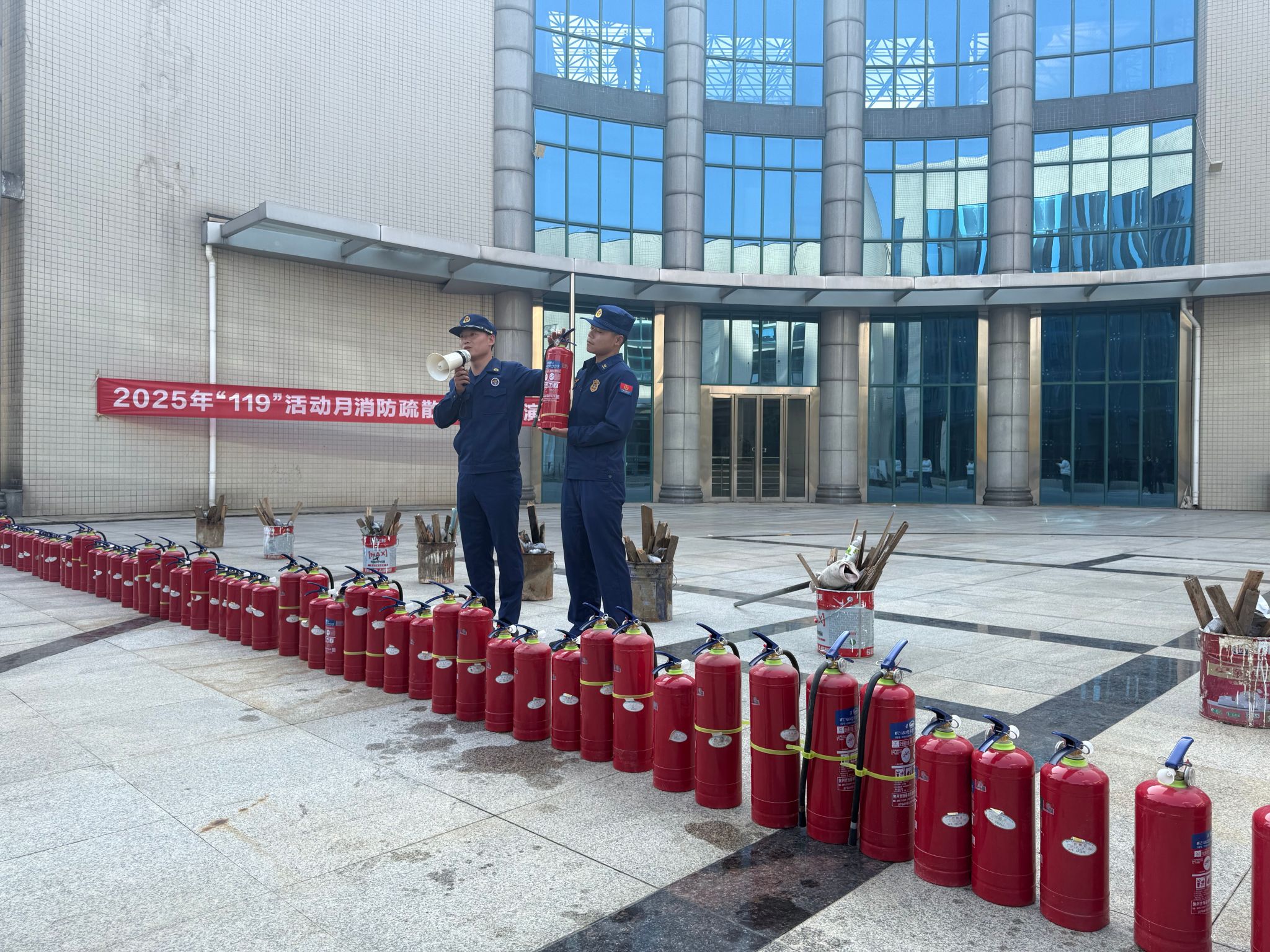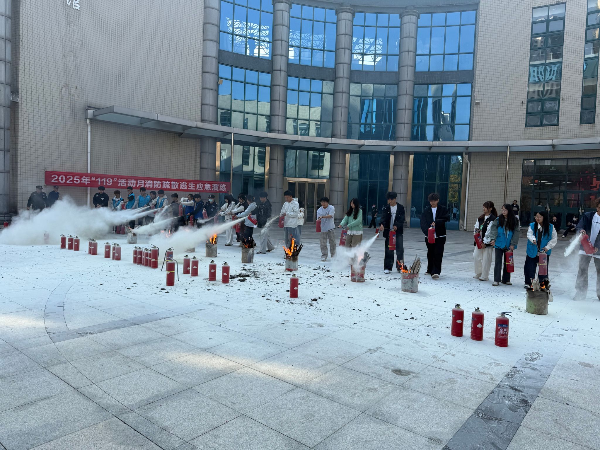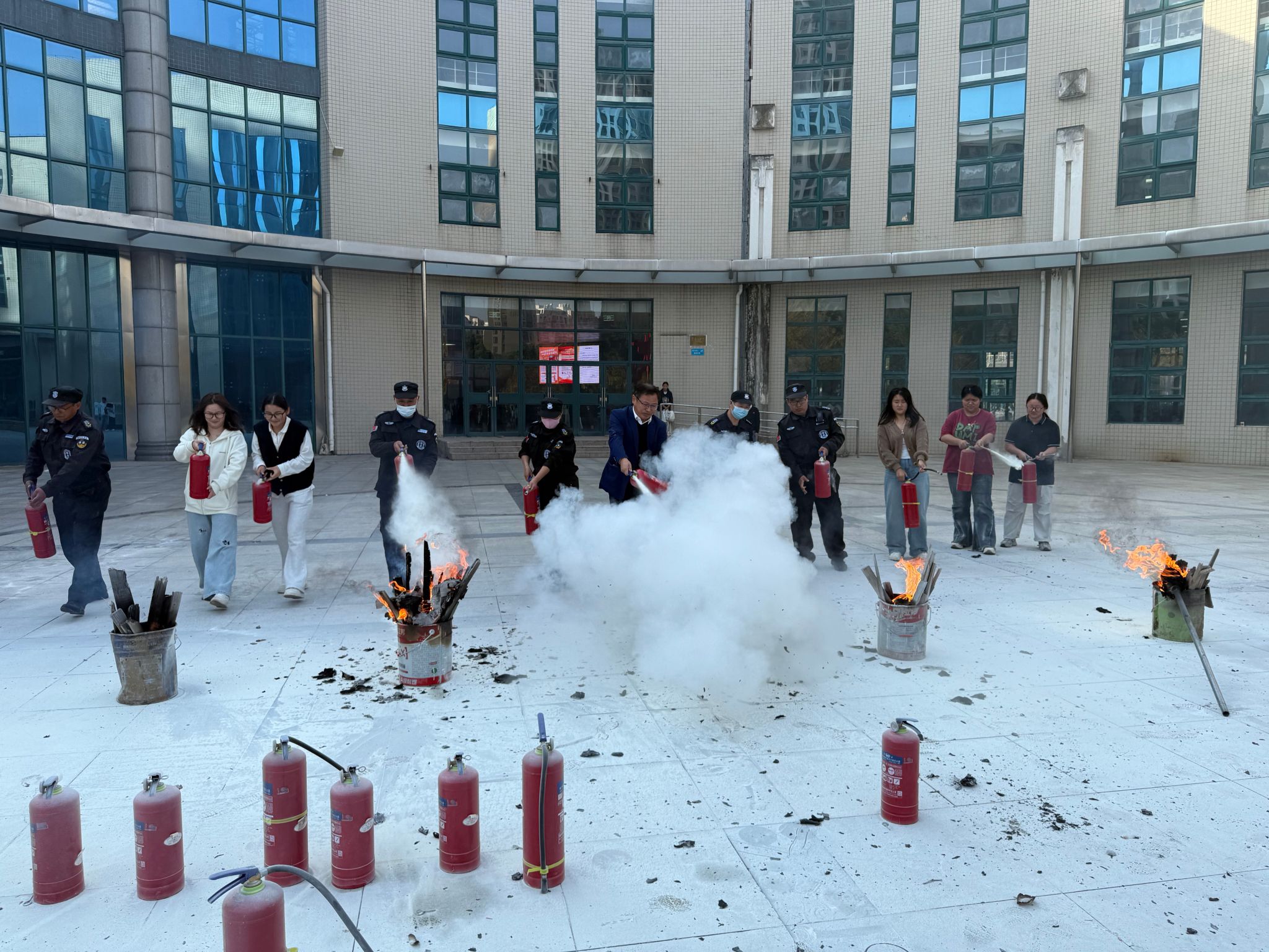 疏散演练结束后,实战技能提升环节在商韵广场接续进行。安全保卫处工作人员预先设置了模拟火点,消防员现场详细讲解了干粉灭火器的构造、性能及操作要领。随后,参训人员在消防员的专业指导下,分批进行了灭火器实操演练,亲身体验了从判断风向、拔销子、握喷管再到压把手喷射灭火的全过程,有效掌握了扑救初期火灾的实际操作技能。