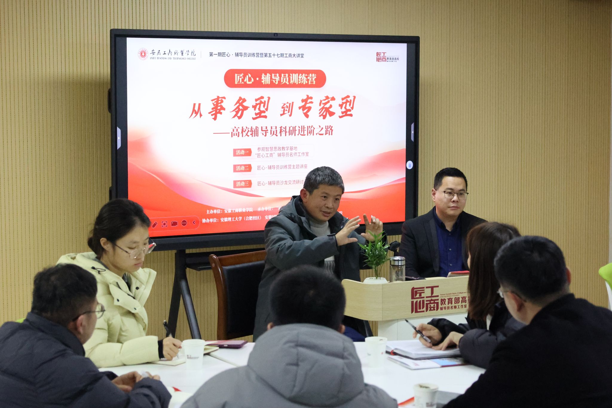 2025年12月24日下午,安徽工商职业学院智慧思政实践教学基地红色报告厅内气氛热烈,学校第一期“匠心·辅导员训练营”暨第五十七期“工商大讲堂”隆重举行。本次活动由教育部“匠心工商”辅导员名师工作室牵头承办,并联合安徽理工大学(合肥校区)、安徽国际商务职业学院、安徽新闻出版职业技术学院共同协办。安徽省教育厅相关处室领导、安徽工商职业学院校领导、四所学校学工部门负责人、部分二级学院党政领导及专职辅导员代表近百人齐聚一堂,围绕辅导员队伍专业化、专家化发展路径,开展深入研讨与交流,共同描绘新时代高职院校思政工作高质量发展新图景。