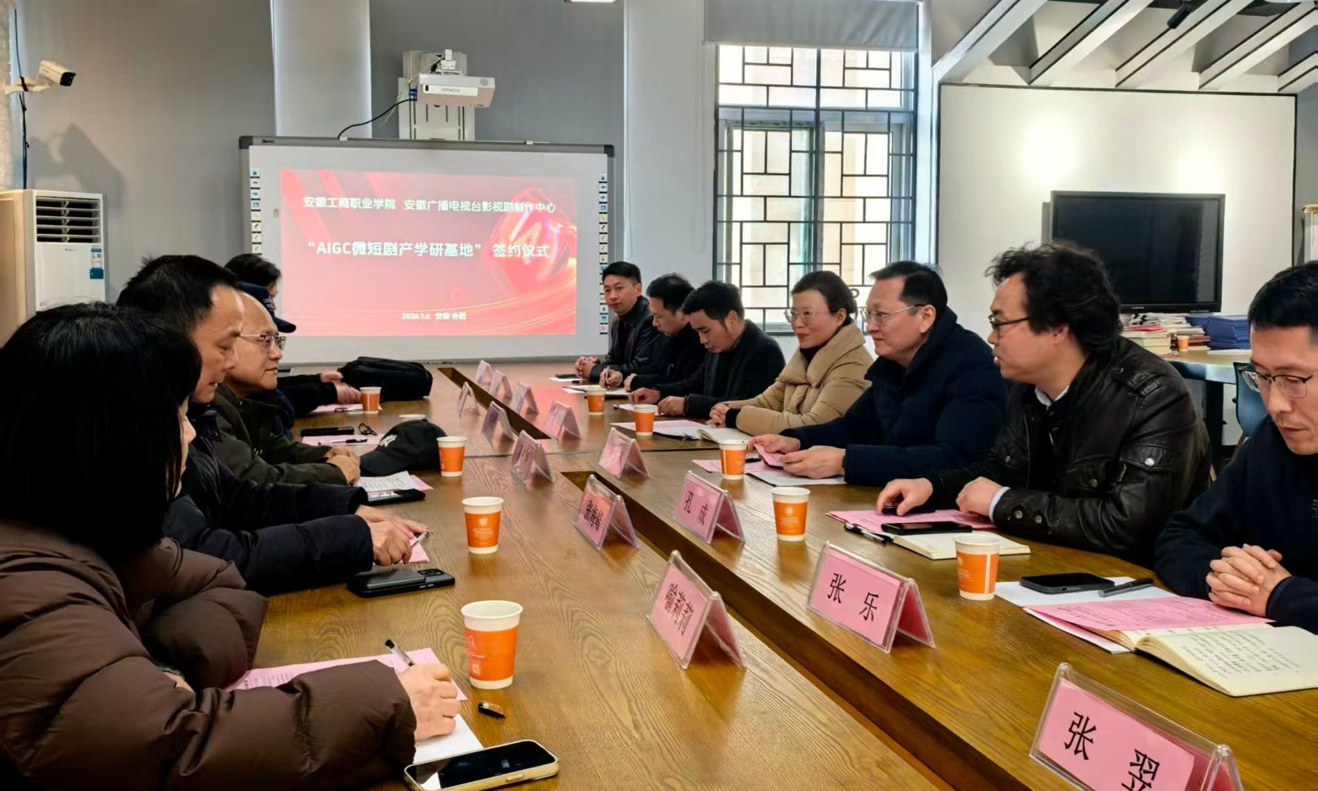 1月6日下午,安徽广播电视台影视剧中心总监翟梓坪,安徽广播电视台影视剧中心副总监、安徽省短视频和微短剧协会会长张海峰等一行莅临庐阳校区艺术设计学院,出席“AIGC微短剧产学研基地”签约仪式。校党委委员、副院长陈章奇,校党委委员、党委宣传统战部部长、艺术设计学院党总支书记孔成,艺术设计学院党总支副书记、院长魏芬,党总支副书记张乐,副院长邱志斌等人陪同接待并参与签约座谈。会议由孔成主持。
