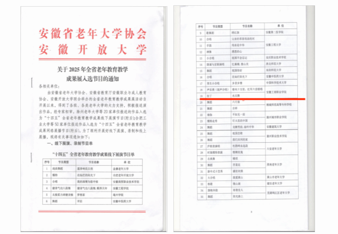 学校积极响应“服务全民终身学习”号召,与杏林街道共建社区教学点,稳步推进老年大学建设。通过修订《安徽工商职业学院老年大学章程》,建立健全管理机制,开设声乐、舞蹈、葫芦丝等多类课程,服务老年学员150余人。老年大学选送的《水兵舞》《春风十万里》等优秀作品成功入选2025年全省老年教育教学成果展线上展演,实现学习成果的高水平展示。