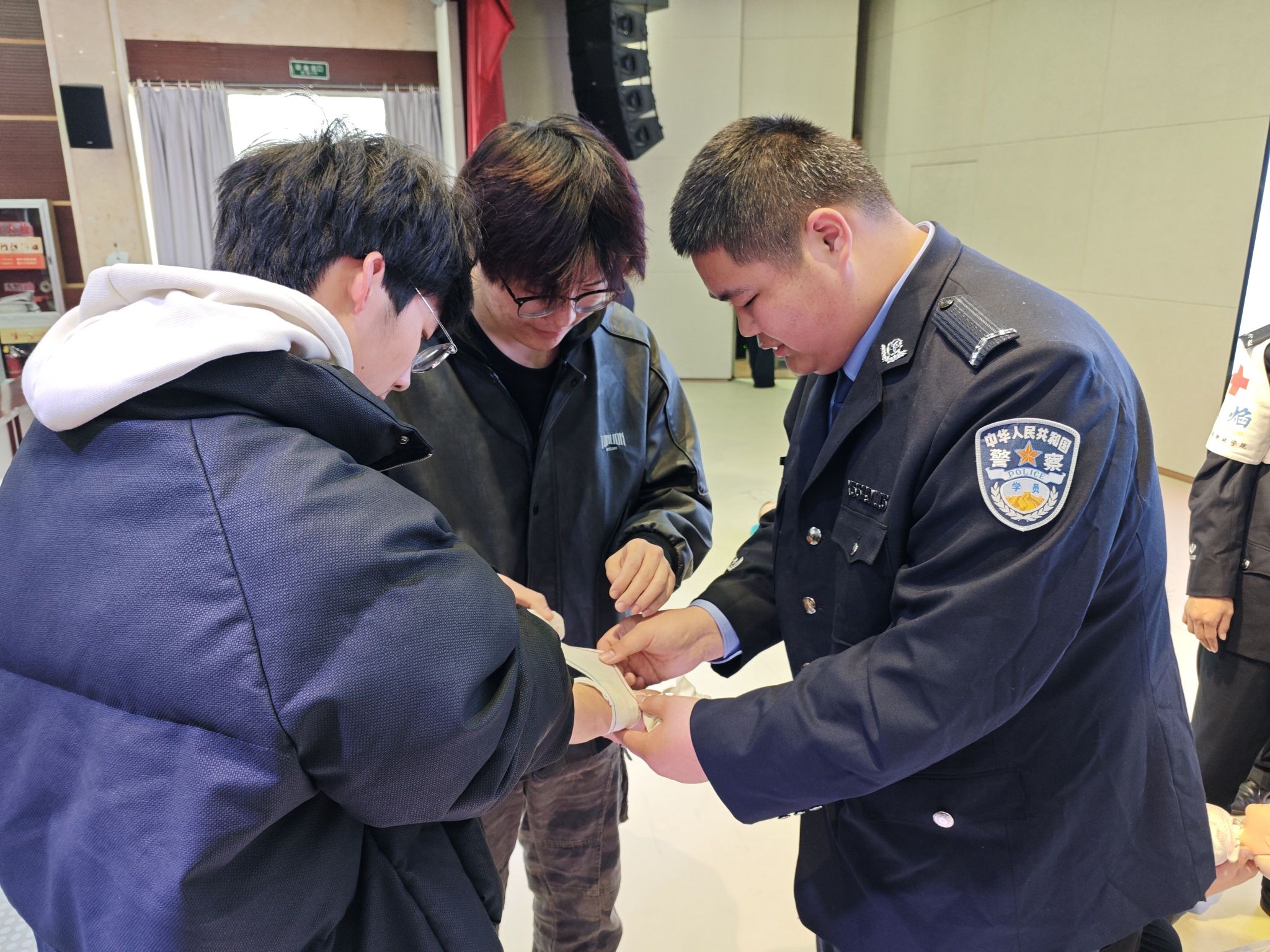 实战“练兵”:急救技能握在手中。培训团队利用人体模型、医用绷带、三角巾、AED训练机等专业教具,分组开展“手把手”教学。在心肺复苏教学环节,志愿者详细讲解了按压位置、深度、频率等关键参数,并利用人体模型进行分步演示。随后,同学们在志愿者的指导下逐一进行实操练习,从判断意识、呼救求援到胸外按压、人工呼吸,力求每一个动作规范到位。在创伤包扎环节,志愿者展示了环形包扎、螺旋包扎、“8”字包扎等常用方法,并邀请同学上台互动,现场气氛热烈。