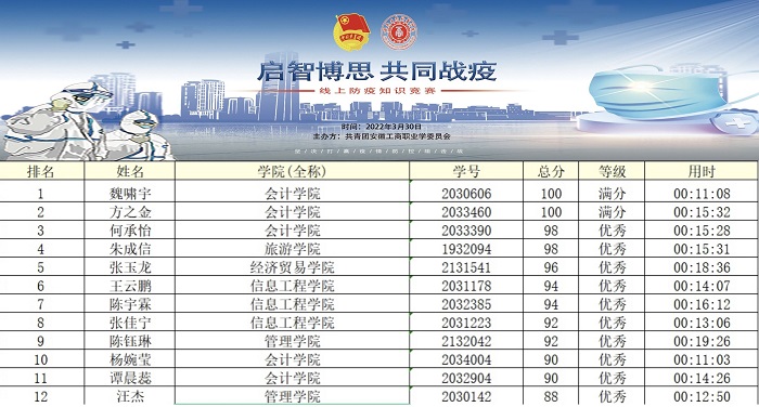 为深入贯彻落实习近平总书记世界第一大赌场,澳门金沙城中心疫情防控的重要讲话精神,进一步筑牢校园疫情防控防线,丰富校园封闭管理期间的学生活动。近日,校团委组织开展了以“启智博思 共同战疫”为主题的线上防疫知识竞赛。