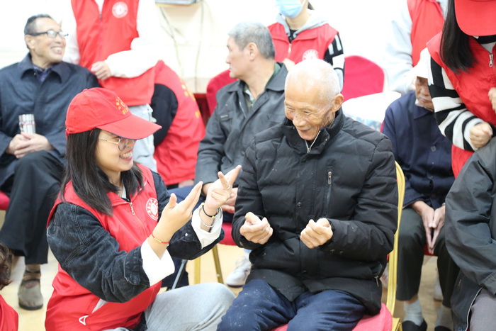 活动伊始,志愿者们将老人们从房间搀扶至大客厅,陪老人们聊天并为他们表演节目。志愿者以传统文化与现代戏曲的结合——快板《三打白骨精》作为开场,老人们随着志愿者舞动的节奏,拍手、跺脚、大笑,场面其乐融融;随后《团结就是力量》、《女驸马》熟悉的旋律,动人的歌词,促进了老一辈和年轻一辈的交流,将气氛推向高潮;最后在手语表演《明天你好》中活动圆满结束。