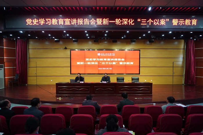 4月7日下午,学校召开党委理论学习中心组(扩大)会议,进一步推进党史学习教育和新一轮深化“三个以案”警示教育,校领导,全体中层干部、党支部书记、专职思政课教师、专职辅导员,青马学会学生代表参加会议。