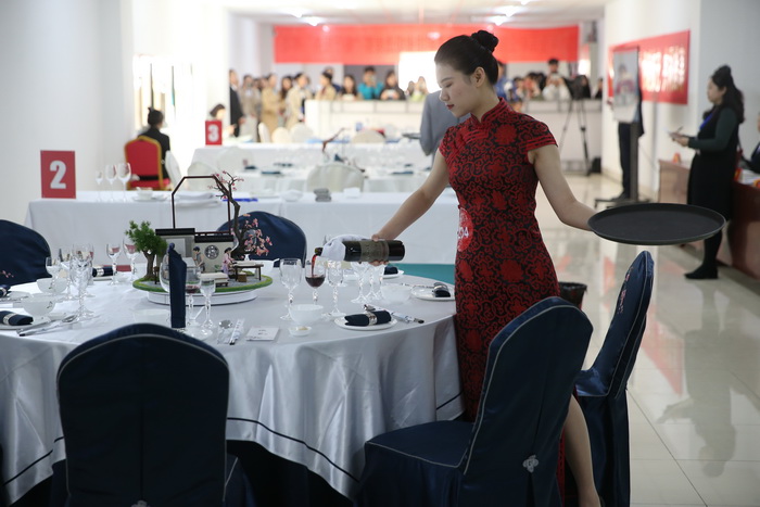 餐厅服务赛项为团队赛,每支参赛队由2名选手组成。比赛包含中餐主题宴会和西餐服务两个部分,内容主要包括中餐服务礼仪展示、中餐服务技能操作、中餐酒水服务、西餐休闲餐厅摆台、西餐鸡尾酒调制、鸡尾酒英文介绍六个模块,赛项内容涵盖了酒店管理专业教学的核心技能和职业素养,主要强调操作的规范会、流程化和职业化。比赛中,选手们用构思巧妙的主题设计、娴熟的操作技能技能、熟练而流利的英文介绍、优雅美丽的职业形象,向大家展示了自己高超的专业技能。
