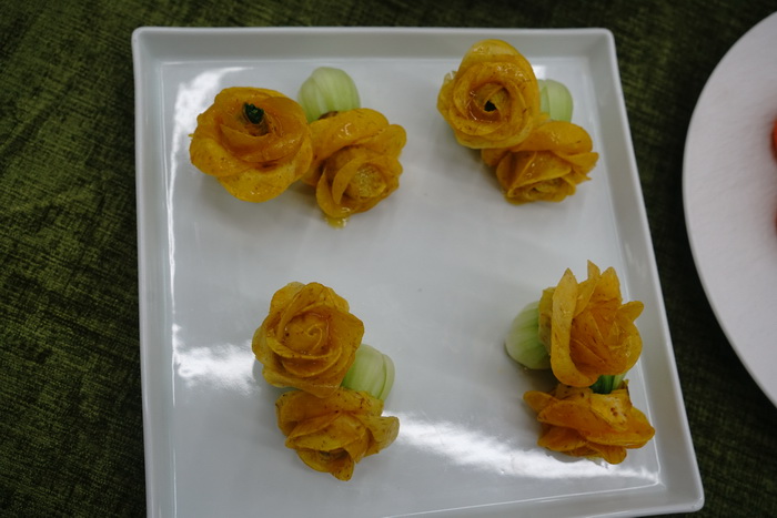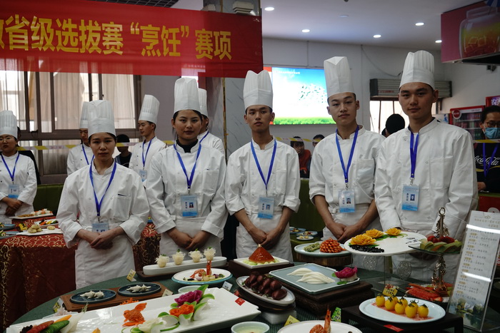 烹饪赛项为团队赛,每队5名参赛选手。比赛包含宴席设计书、宴席制作、宴席展评三个环节。通过宴席设计书策划、宴席作品制作、宴席展台效果等内容,检验参赛选手的现场设计与应变能力、营养搭配与计算能力、规范操作水平及创新创意能力和水平。一样样普通的食材在选手们的手中顷刻间变成了一件件“艺术品”,选手们精湛的厨艺让大家叹为观止。