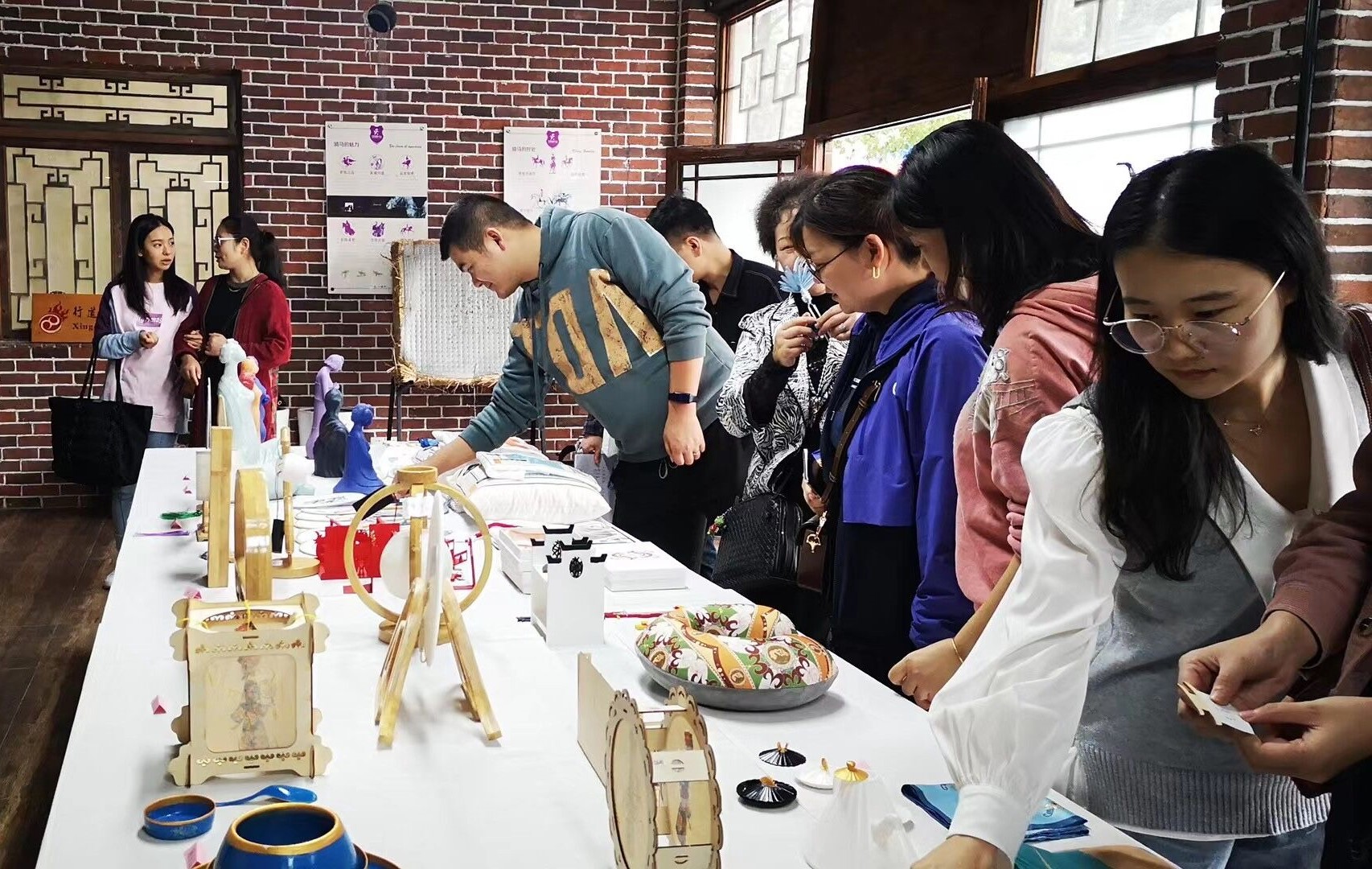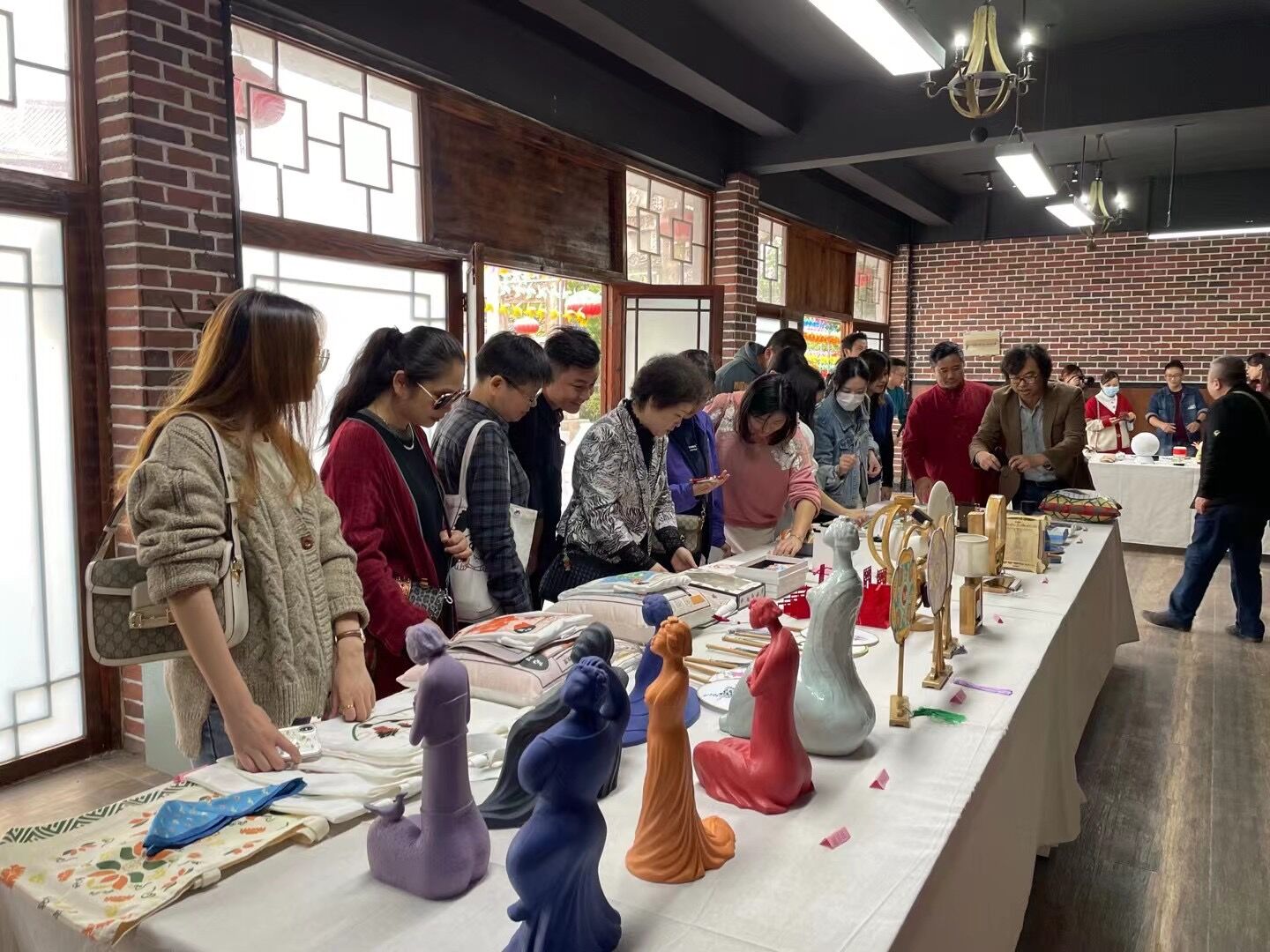 接下来,孔院长带领老师们参观了正在筹建中的我院合瓦VISION文创坊,介绍了前期筹备与此次展览的布置情况。此次应中国非遗园的特邀入驻园区,给予非遗园入门主干道上一栋两层徽式建筑楼,面积达到500平方,一楼为作品展示和展演区,二楼为大师工作坊和学术报告厅。在一楼已经布展的是2019级产品艺术设计专业毕业设计文创产品和马业长大师团队的陶艺作品。艺术设计学院一直倡导教学成果转化,将学生作品商品化,今天展现出来的作品形式多样、内容丰富,反映了同学们的艰辛付出和阶段性成效,也是我院师生用行动践行以人的全面发展为中心的培养理念,用艺术彰显文化,用设计展现创意。