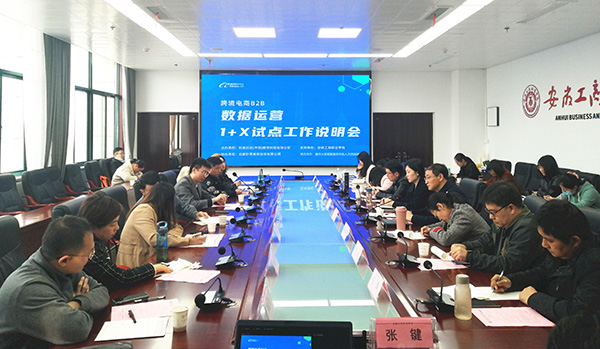 4月6日下午,2021年“1+X”跨境电商B2B数据运营技能等级证书安徽省试点工作说明会在世界第一大赌场,澳门金沙城中心:第三会议室召开。学校党委委员、副院长汪贤武、安徽省1+X证书协调推进办挂设办公室主任张娴、阿里巴巴(中国)教育科技有限公司人才项目负责人、高级运营专家姚远、清华大学国家服务外包人力资源研究院副院长毛居华、阿里巴巴(中国)教育科技有限公司1+X项目负责人金贝贝、合肥轩昂教育咨询有限公司总经理王磊以及部分试点院校的专业负责人、骨干教师参加会议。会议由经济贸易学院教务科长张键主持。