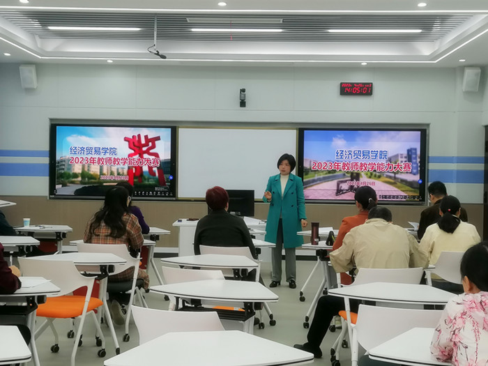 为落实立德树人根本任务,深化“三教改革”,推进“岗课赛证”综合育人,4月26日中午,经济贸易学院2023年教师教学能力大赛在学院多功能智慧实训中心拉开帷幕。经济贸易学院院长张颖教授、安徽省教学能力大赛专家、学校院办方灿林副教授、金融教研室周瀚醇副教授受邀担任现场评委。经济贸易学院全体教师观摩了比赛。
