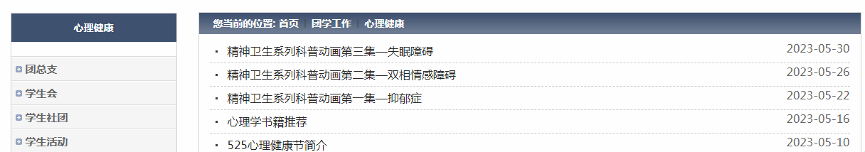 从5月份开始,学院每周在心理健康板块分享一篇有关心理健康的文章,内容包括心理百科、心理学书籍推荐、精神卫生系列科普动画等,以图文并茂的形式制作主题推文,增加知识的趣味性和针对性,帮助同学们丰富对心理健康知识的了解,树立科学心理健康理念,提升心理保健意识。