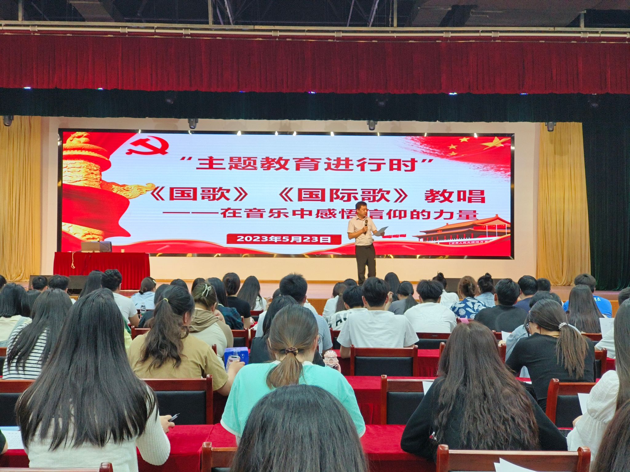 为深入开展学习贯彻习近平新时代中国特色社会主义思想主题教育,强化爱国主义教育,培养学生感恩情怀,会计学院党总支组织开展“《国歌》《国际歌》教唱——在音乐中感悟信仰力量”专题党课,本次党课由杨磊老师主讲,会计学院学生党员、发展对象和第三十五期入党积极分子参与了学习。