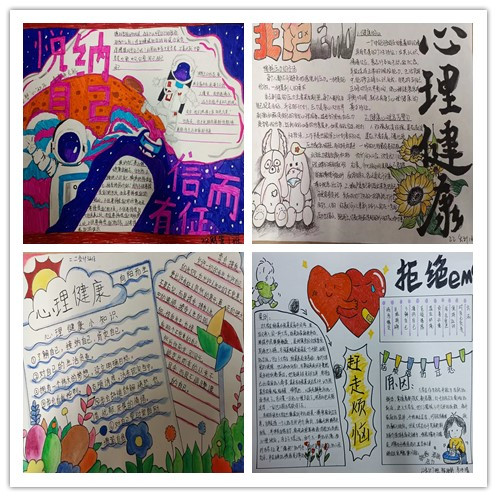 手抄报评比,营造氛围。充分利用手抄报营造良好的心理健康教育氛围。同学们自己设计、制作的手抄报《归零压力》《悦纳自己》等,讲述了心理健康的重要性,提供了缓解压力的方法,既有知识性,又充满了趣味性,起到了很好的宣传教育作用。