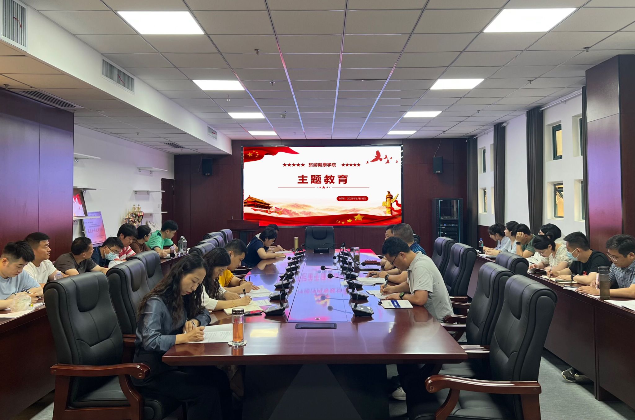 为深入开展学习贯彻习近平新时代中国特色社会主义思想主题教育,5月31日下午,旅游健康学院党总支召开主题教育“三问”学习交流会。会议由旅游健康学院党总支书记杨锐主持,全院教师参加会议。