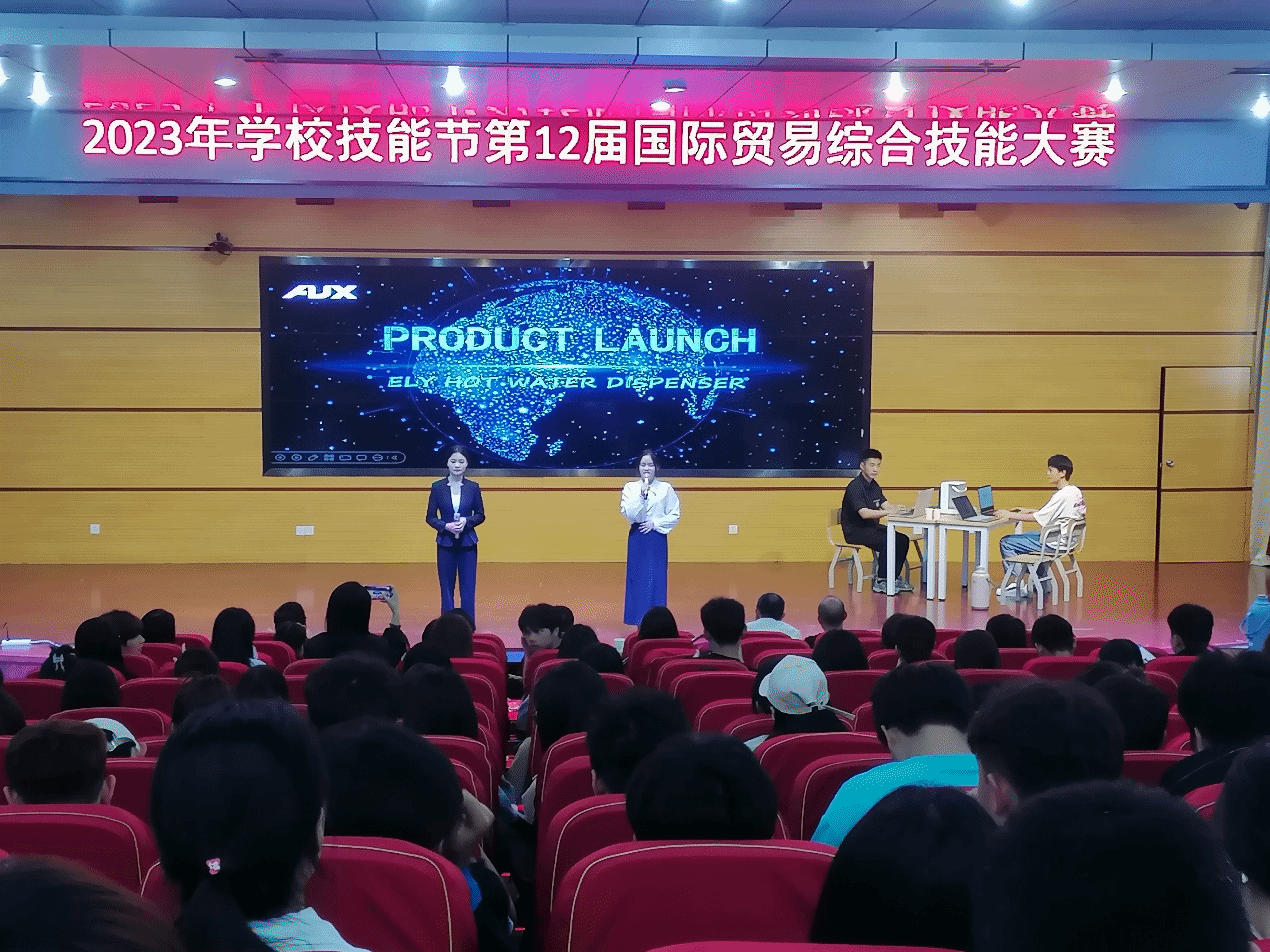 国际贸易新产品发布会大赛以现场赛形式进行。4月27日下午,该赛项在学校学术报告厅隆重举办。经济贸易学院院长张颖出席大赛并担任评委。大赛采取全英文方式进行外贸产品推介。参赛的各代表队自行寻找合作厂商提供产品,包括颈部按摩仪、蓝牙耳机、饮水机、茶叶、加湿器、VR眼镜等新颖创新的适销外贸参展商品。每队派出2名英文主讲配以PPT,并辅以现场产品功能展示、情境剧、模特秀等丰富多彩的形式来进行推介。比赛锻炼和提升了学生的英语口语、外贸展示、商业策划书写作、团队合作和创新创业等职业技能。