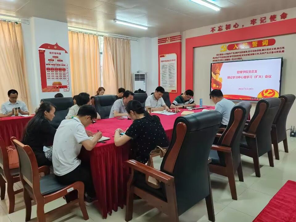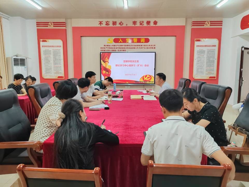 6月14日中午,管理学院党总支在学院党员活动室召开理论学习中心组学习(扩大)会议,专题学习习近平新时代中国特色社会主义思想,交流学习心得体会。学院党政领导班子成员、全体党员参加会议,学院党政办公室主任汪锋主持学习交流会。