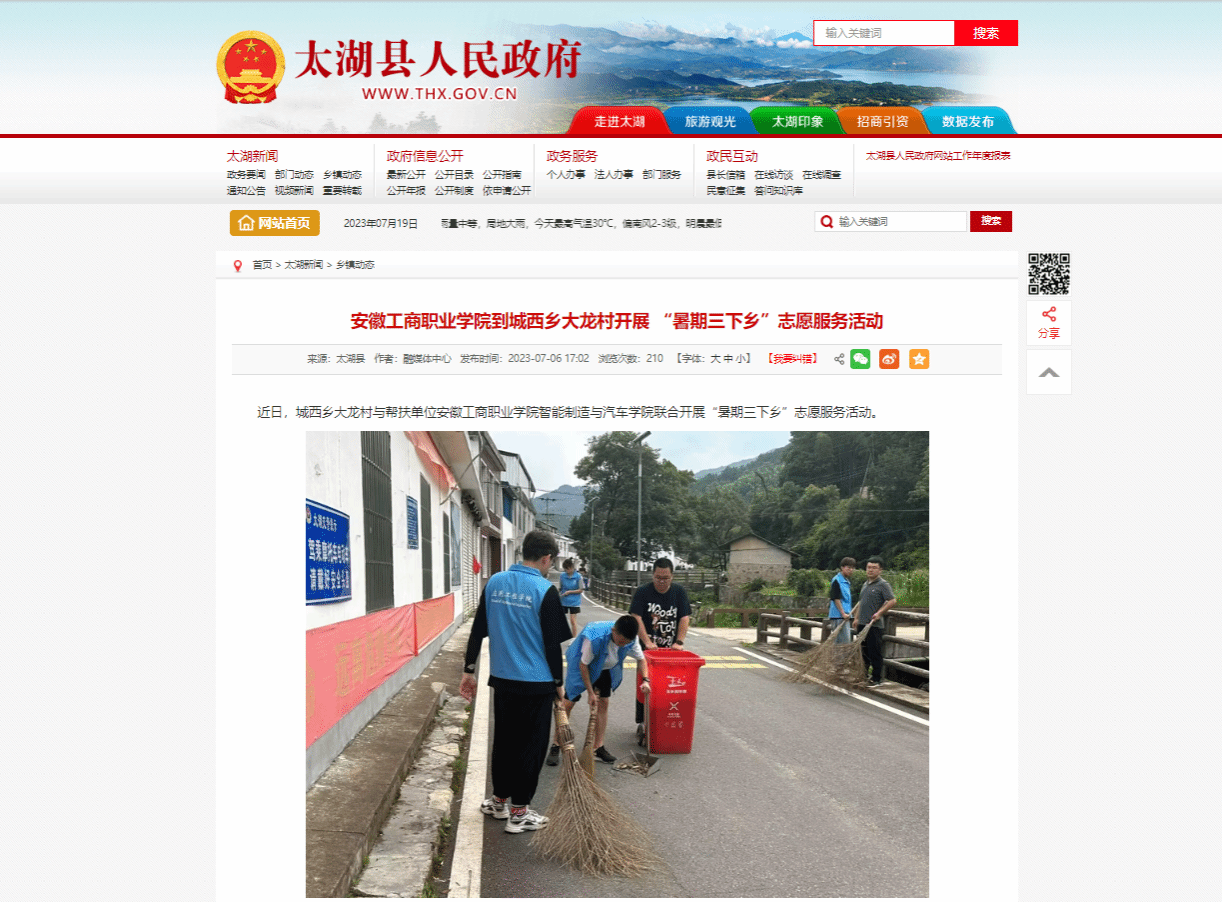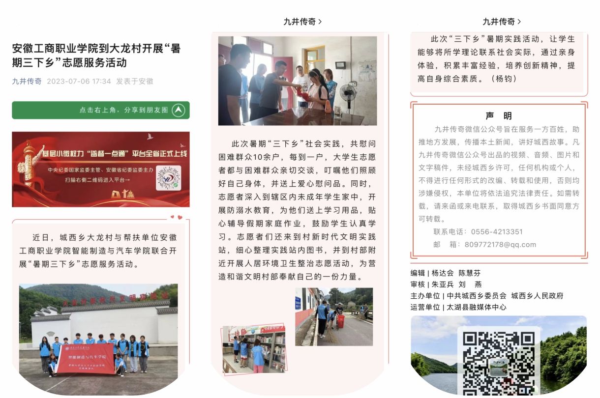 实践团队此次赴大龙村暑期“三下乡”社会实践活动得到了太湖县人民政府、城西乡党委、大龙村党总支、大龙村新时代文明实践站等部门的大力支持和配合。太湖县人民政府网站、太湖县融媒体中心等单位对活动进行了报道。实践团队以“贡献青春力量,助力乡村振兴”为主线,引导广大青年学子在亲身体验中了解世情国情,在服务奉献中厚植爱国情怀,在实践锻炼中增长知识才干,坚定不移听党话、跟党走,立志做有理想、敢担当、能吃苦、肯奋斗的新时代好青年。(撰稿:柯主 审核:丁浩)