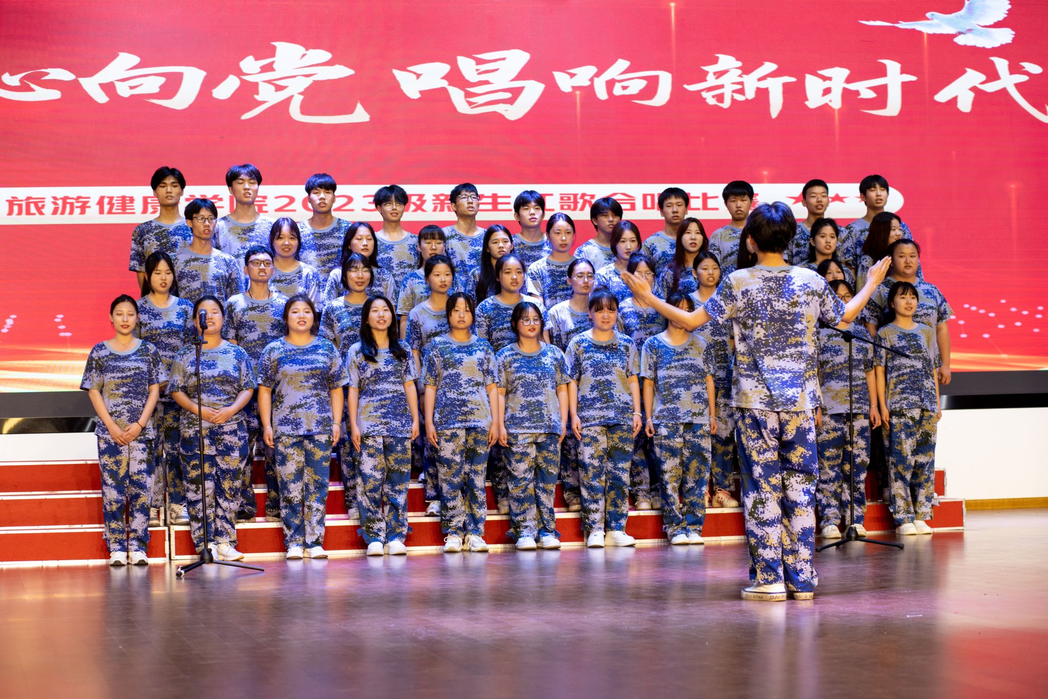 为隆重庆祝中华人民共和国成立74周年,引导青年大学生不断坚定理想信念,树立崇高信仰,让新时代大学生唱响爱党爱国主旋律,歌颂党的丰功伟绩,激发学生的爱党爱国热情。9月28日中午,旅游健康学院举行“青春心向党、唱响新时代”2023级新生红歌比赛,旅游健康学院党政领导班子及全体新生专职辅导员出席本次活动并担任比赛评委。