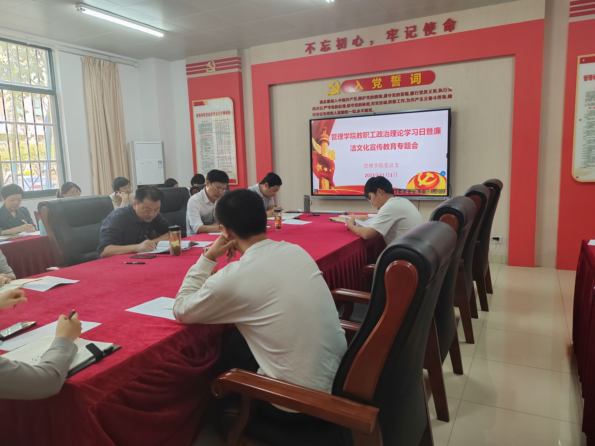 为持续巩固深化主题教育成果,提升全体教职工廉洁素养,11月1日中午,管理学院在党员活动室召开11月份教职工政治学习会议暨廉洁文化宣传教育专题会,认真学习习近平总书记重要讲话精神,传达学校廉洁文化宣传教育文件精神,部署安排学院廉洁文化宣传教育具体工作。学院党总支书记曹大友主持会议,校党委委员、管理学院院长朱小龙及全体教师参加会议。