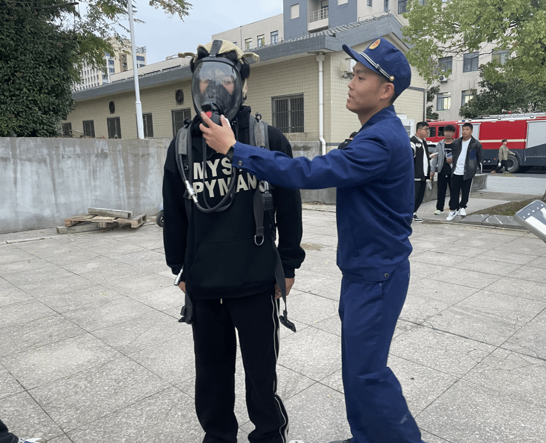 在灭火演练环节,消防教官指导现场师生员工亲手操作,使用灭火器扑灭明火,掌握灭火方法和逃生技能。教官还给师生们展示了消防防毒面具、正压式空气呼吸器、无齿锯等消防器材,并指导同学们试戴消防装备,邀请大家亲身参与实操。