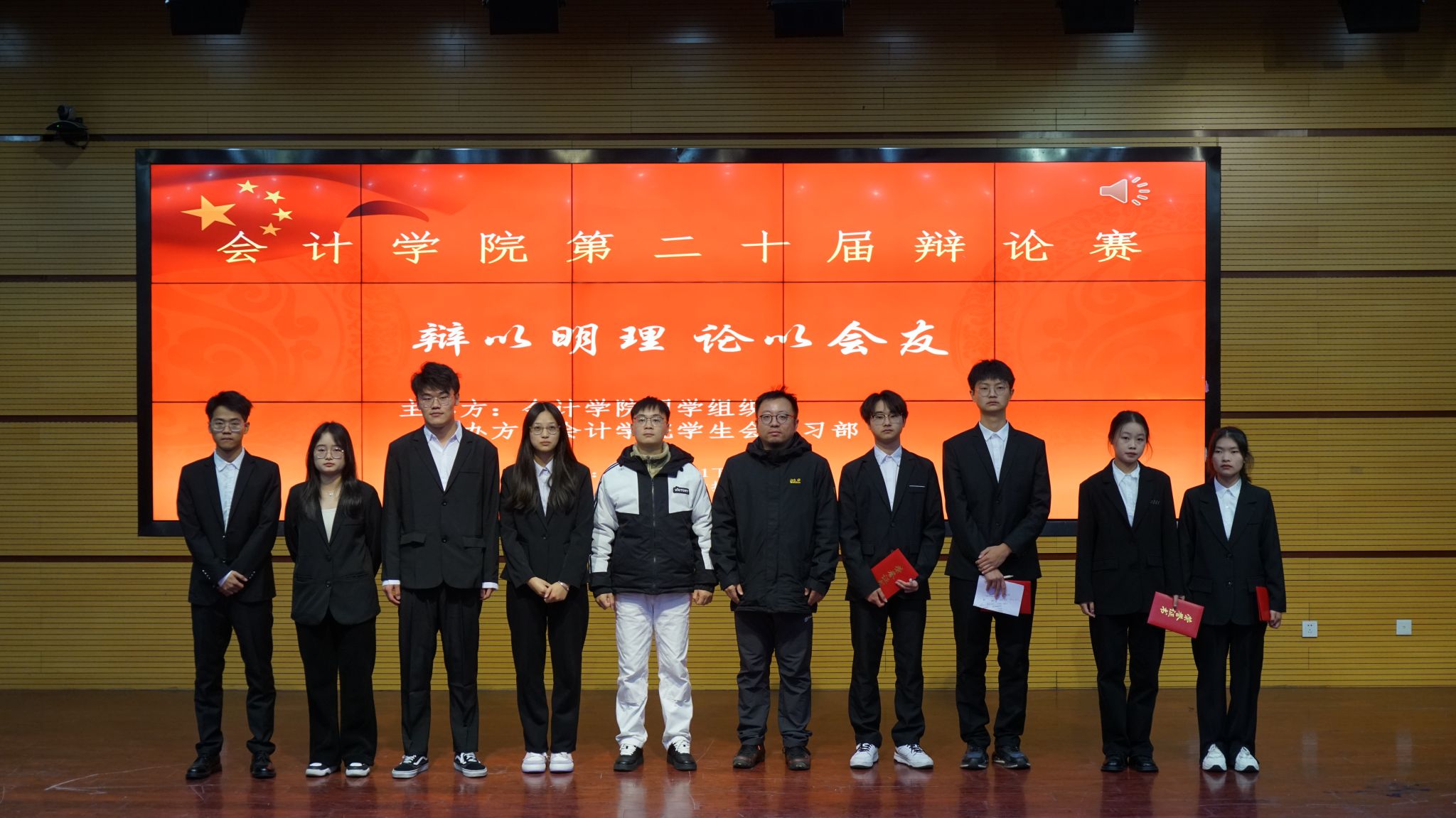 12月11日,会计学院第二十届大学生辩论赛决赛在双凤校区学术报告厅顺利举行。会计学院团总支书记陈嵊、辅导员老师魏浩胜、校辩论队队长及学院各学生组织负责人出席活动并担任现场评委,同时现场有一百余名观众前来观赛。
